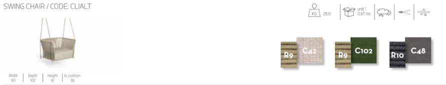 L’Altalena della collezione Cliff è ideale per personalizzare uno spazio da esterno. Gli elementi tipici della collezione, come l’uso della corda nautica sintetica per rivestire lo schienale ed i braccioli, si accompagnano alla forma nuova del prodotto. L’Altalena, sostenuta nel suo movimento da corde agganciate fin dalla base, mantiene la sicurezza dell’alluminio, usato per la struttura, assieme alla comodità della seduta, realizzata in quick dry foam e rivestita di tessuto resistente agli agenti atmosferici.