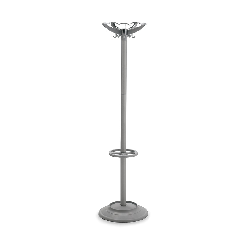 Appendiabiti con portaombrelli con struttura in acciaio a sezione tonda con finitura verniciata nera e parti plastiche in nylon nero, oppure cromata e parti plastiche in nylon nero oppure grigia e parti plastiche in nylon grigio.