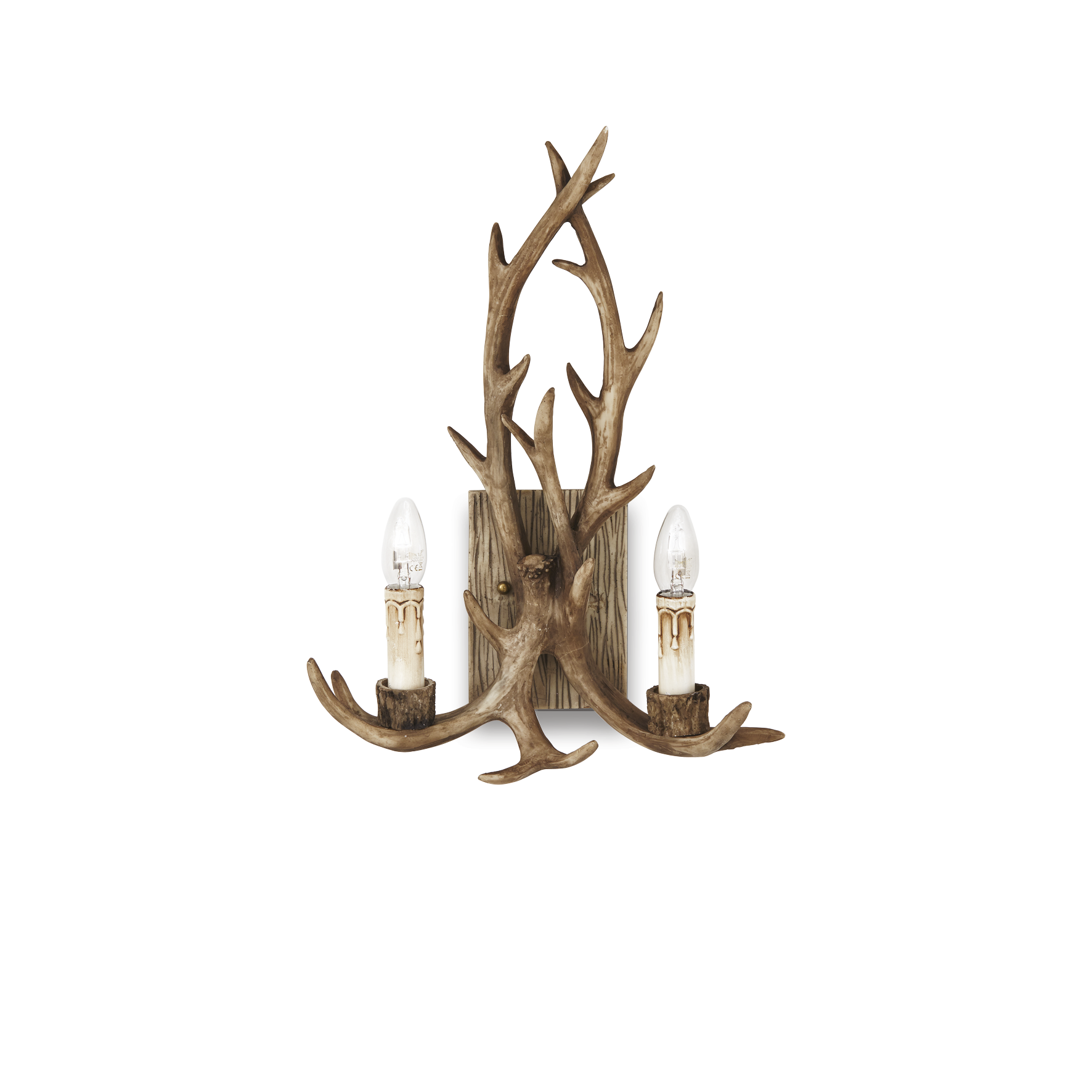 Applique a muro Chalet con montatura con struttura portante in metallo. Elementi decorativi in resina lavorata artigianalmente e dipinta a mano come fedele riproduzione di corna e legno intagliato. Lampadine escluse.