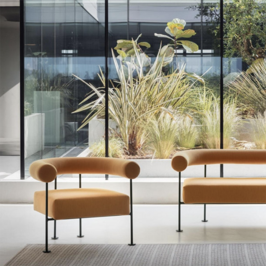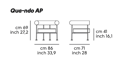 Poltrona lounge Qua-ndo con struttura in metallo. Sedile e schienale in tessuto, pelle o similpelle. Configurata in metallo cat. O1 o O2 con cuscini rivestiti in tessuto specifico per outdoor è idonea alla collocazione all'aperto, escluse zone balneari.