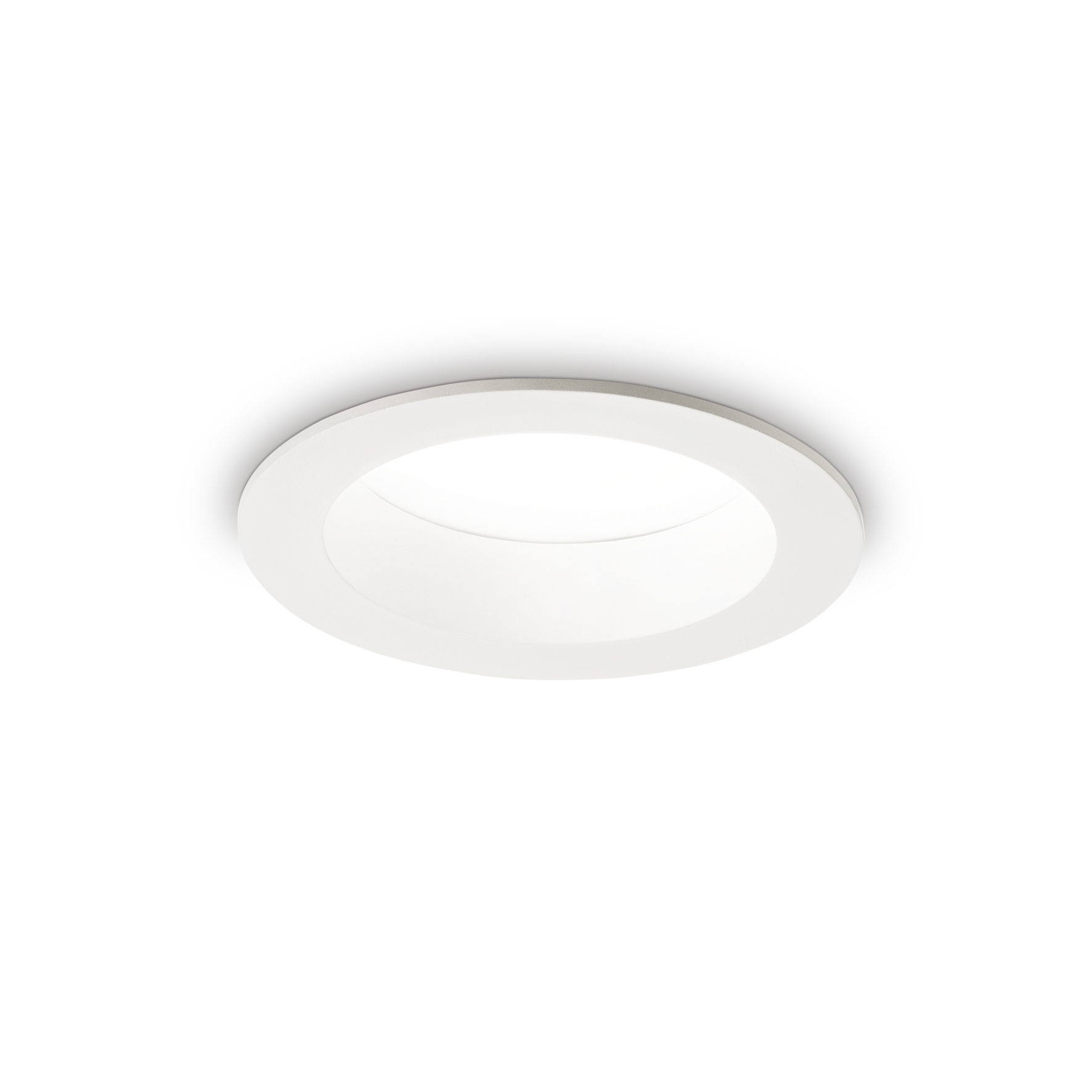 Faretto a incasso in alluminio pressofuso con ghiera rotonda, adatto per installazione su soffitti in cartongesso. Finitura bianca opaca, tecnologia COB Chip on Board e SMD. Protezione frontale IP44 (a prodotto installato).