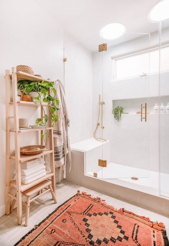 Il suo arredo è composto da due scaffali dalle linee semplici, qualche prodotto per la cura del corpo, un tappeto dalla tonalità neutre e una tenda molto sobria che incornicia una piccola finestra. L’ambiente è luminoso, c’è giusto qualche decorazione, solitamente una pianta non molto grande, e si preferisce installare una doccia perché più pratica e facile da pulire.