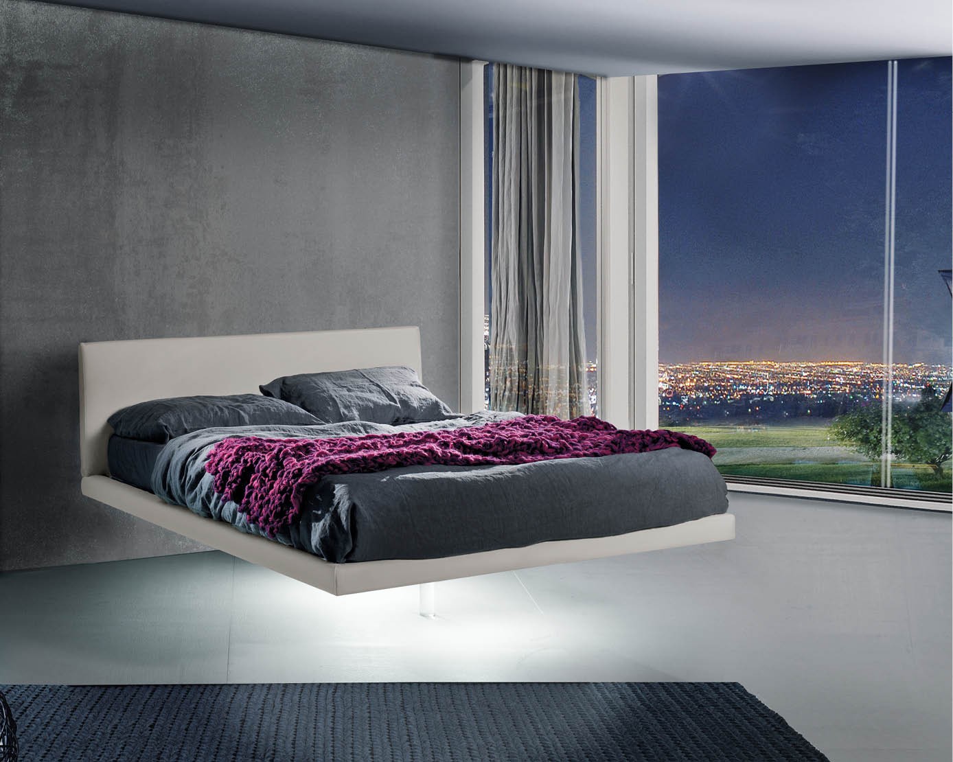Letto sospeso in una camera moderna: iconico e sofisticato