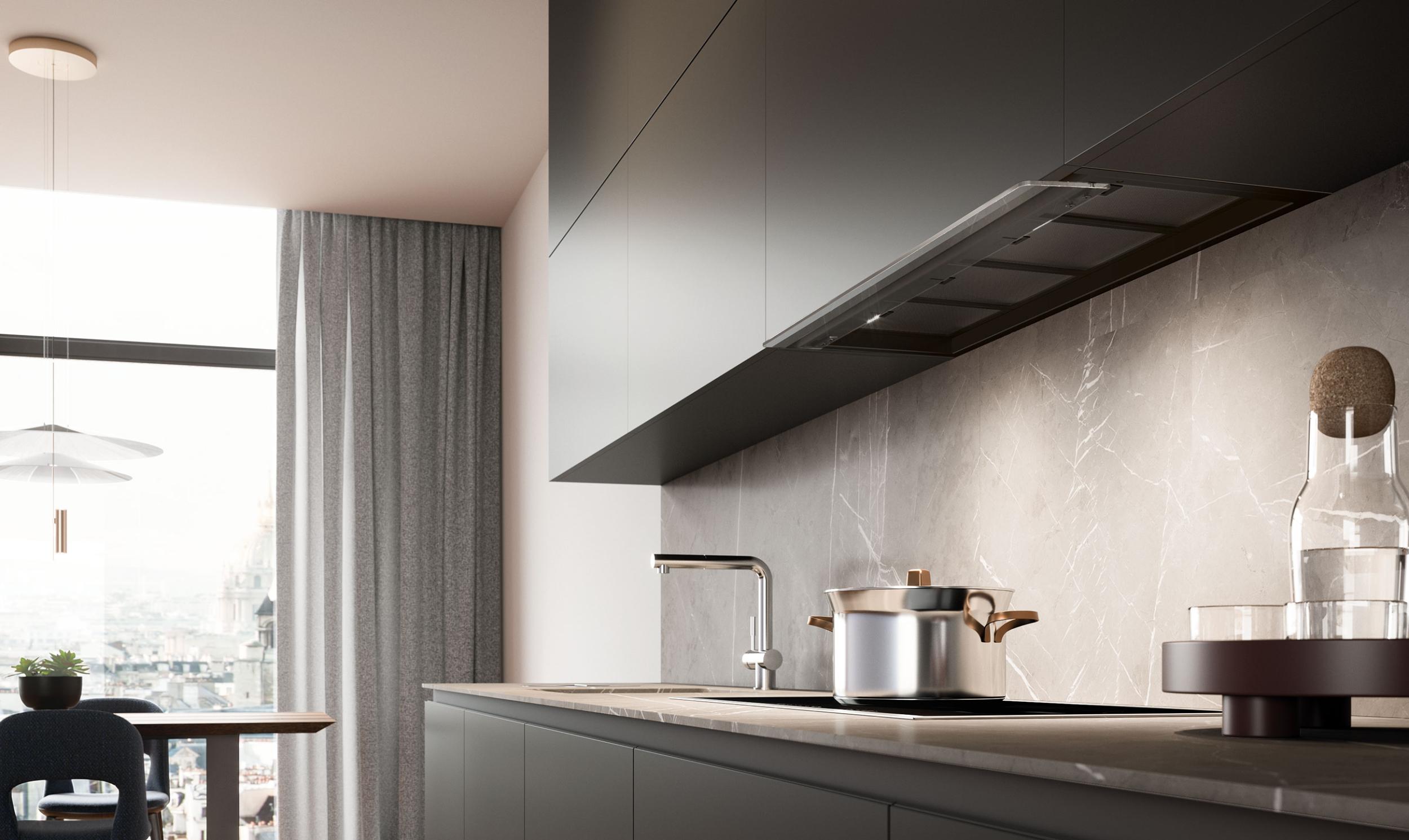 La cappa Virgola Evolution si caratterizza per un design funzionale ed elegante, adatto per le soluzioni d’arredo lineari, dove la cappa si inserisce all’interno del pensile, garantendo funzionalità e massima ottimizzazione dello spazio al suo interno.