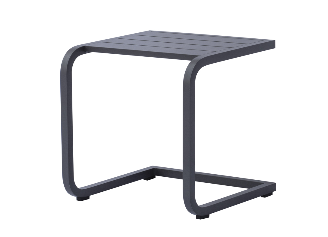 Der 40 x 40 cm große, anthrazitfarbene Couchtisch aus Aluminium mit Lattenstruktur vereint Praktikabilität und Funktionalität. Das Aluminiumgestell sorgt für Stabilität und geringes Gewicht, während die Lattenstruktur der Tischplatte das charakteristische Design prägt.