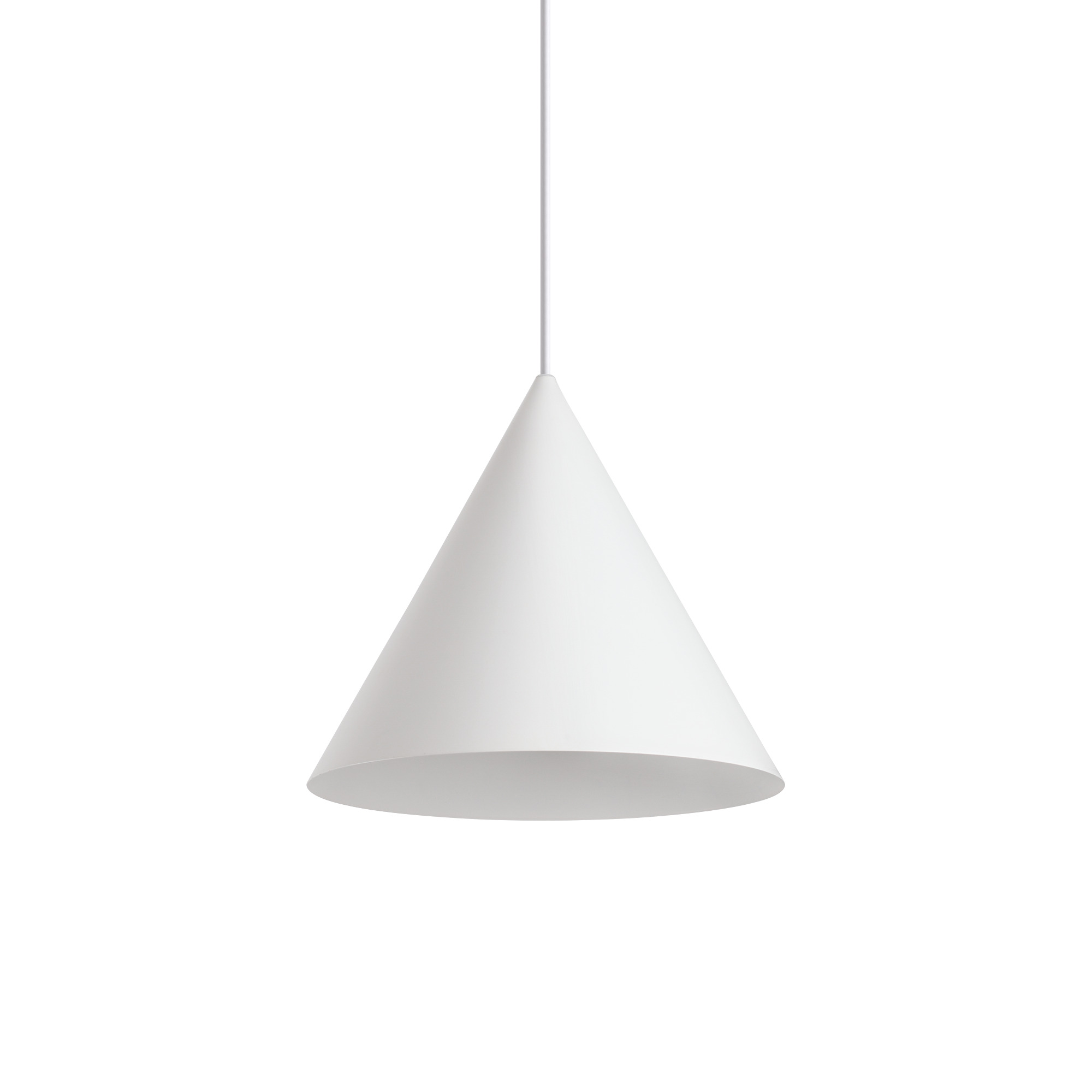 Hängeleuchter in A-Linie mit Rosette aus pulverbeschichtetem Metall. Mattweiß lackierter Metalldiffusor mit weißer Innenseite. Stoffummanteltes Kabel. Glühbirne ausgeschlossen.