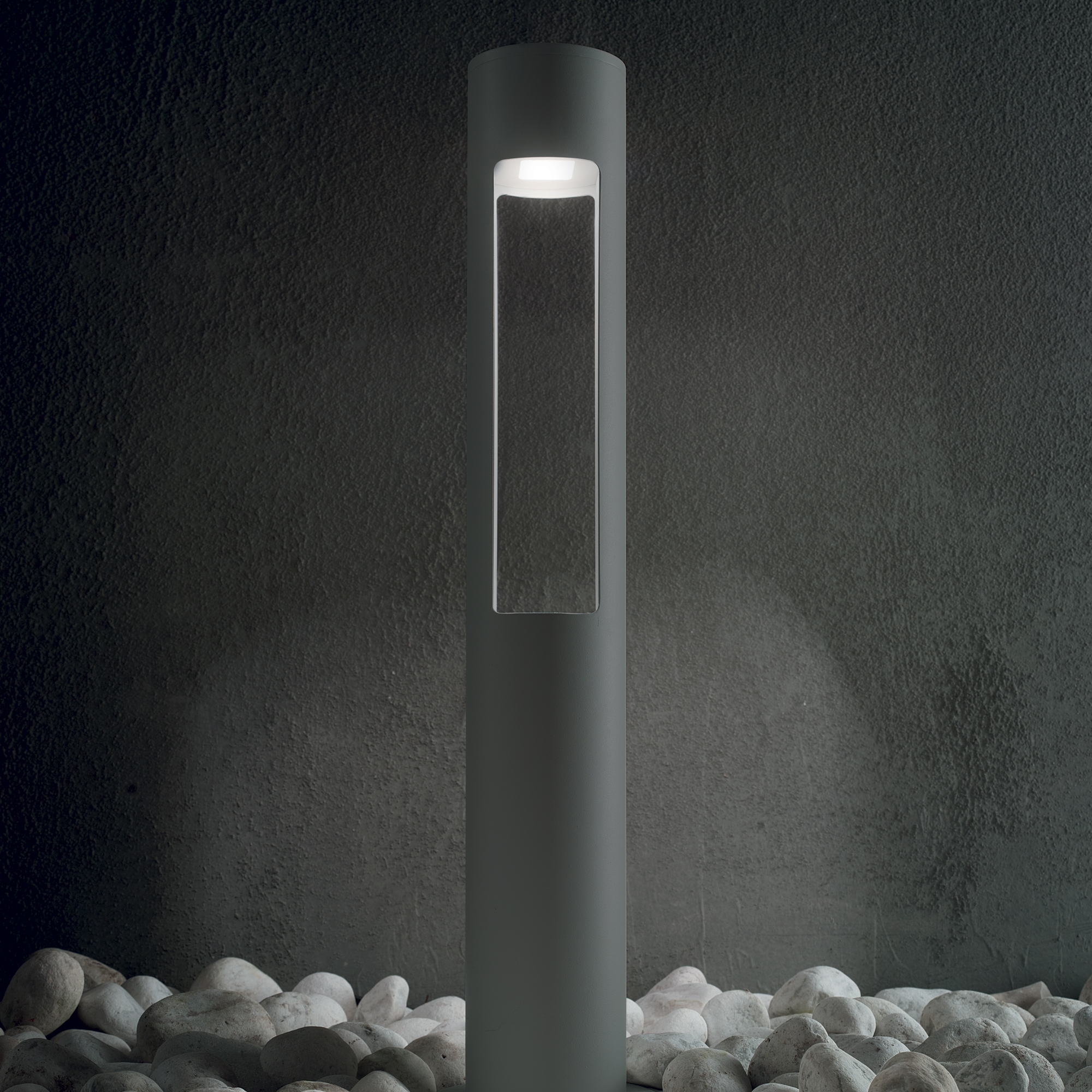 Stehleuchte für den Außenbereich mit Leuchtenkörper aus gedrehtem Aluminium, matt lackiert mit Anthrazit-Finish. Diffusor aus gehärtetem Glas. Glühbirne nicht im Lieferumfang enthalten.