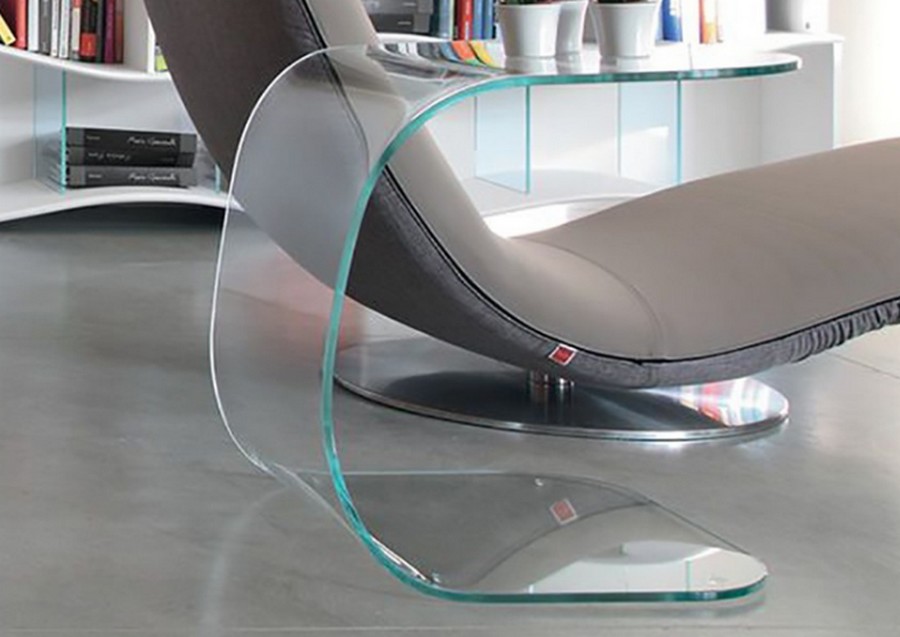 Alaric Couchtisch von Tonin Casa und aus gebogenem Glas mit Doppelregal und Zeitungsständer. Alaric ist eine weiche und essentielle Linie. das macht die besondere Verarbeitung von gebogenem Glas Protagonist. Die Kurven und Aussparungen von Alaric dienen nicht nur als t, sondern auch als Doppelregale und Zeitungsständer