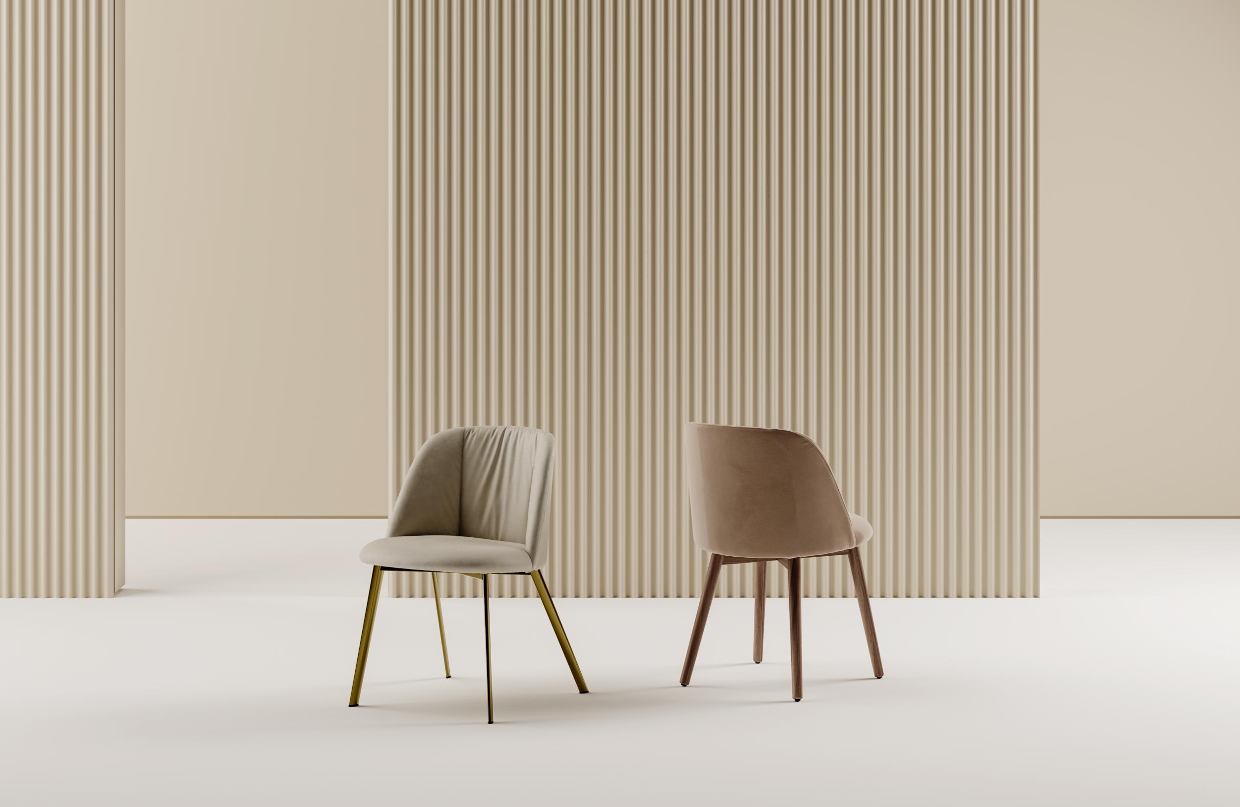 Stuhl mit Gestell aus Massivholz oder lackiertem Stahl. Gepolsterte und gepolsterte Schale in zahlreichen Ausführungen und Farben.