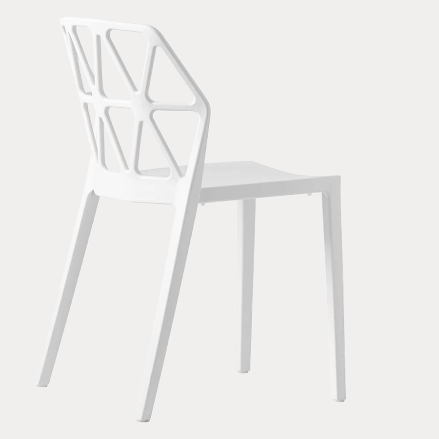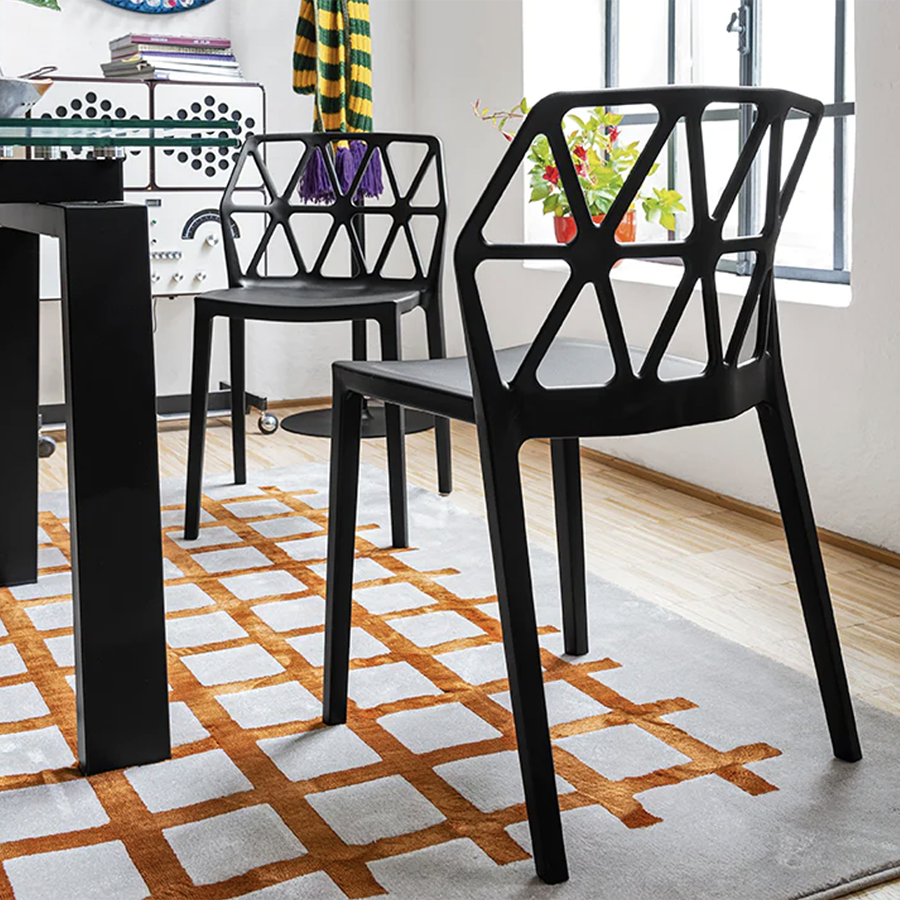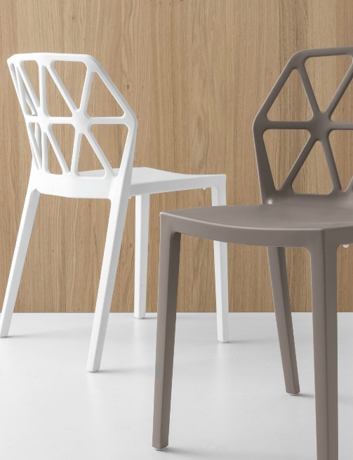 Alchemia CB1056 Stuhl von Connubia. Vollständig aus Polypropylen hergestellt, mit Airmoulding-Technologie. Es verfügt über eine fotogeätzte, matte Oberfläche und ist auch für den Außenbereich geeignet. Stapelbarer Stuhl für sechs Personen.