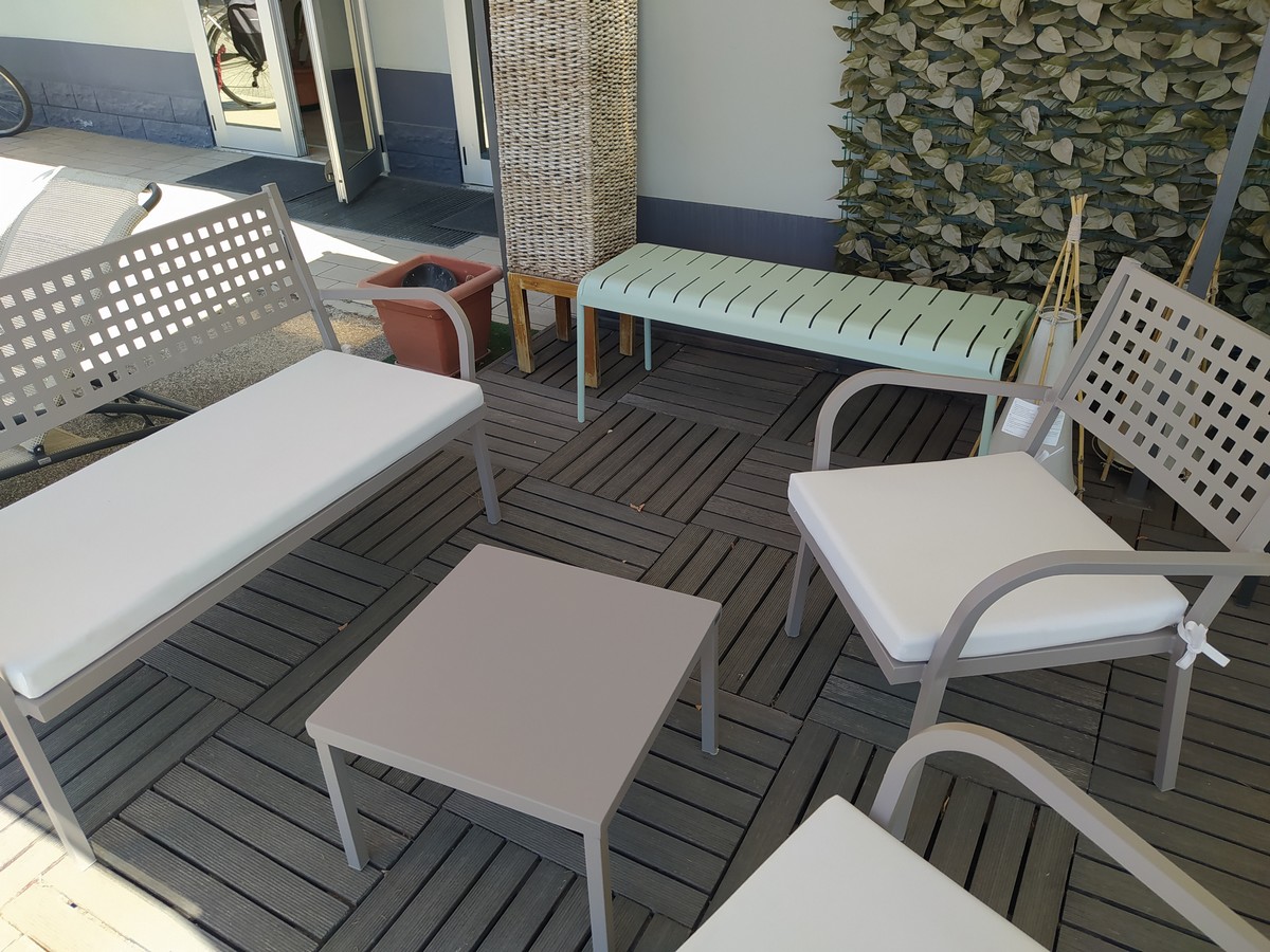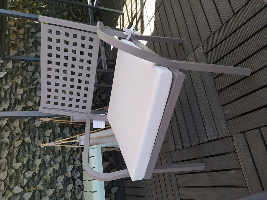 Alice Loungesessel von Vermobil verzinkt, stapelbar, dessen schlichte und essentielle Formen das Symbol für die kontinuierliche Suche nach Qualität und Freude am Leben in der Welt des Gartens sind. Dieser Sessel bereichert die Umgebung im Freien mit einer minimalen Auswahl an Möbeln. Erhältlich in Mud, angereichert mit einem bequemen weißen Kissen.