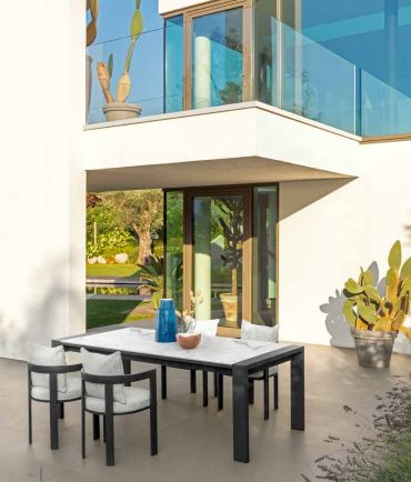 Der Esstisch aus der Argo Alu Kollektion von Talenti ist in drei Größen erhältlich: zwei rechteckigen und einer quadratischen. Der Argo Alu Tisch verfügt über ein robustes Aluminiumgestell in drei verschiedenen Farben. In Kombination mit der strapazierfähigen Steingutplatte eignet er sich perfekt für verschiedenste Außenbereiche.
