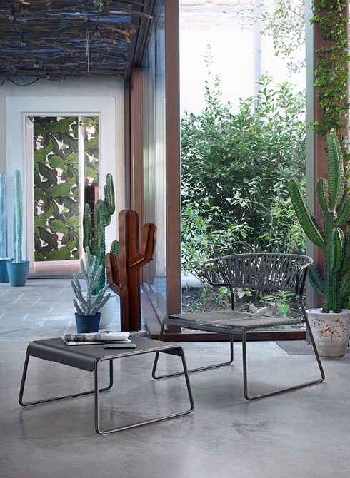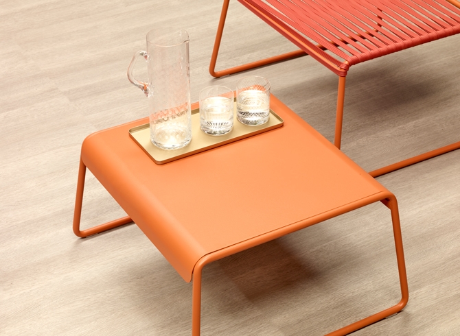 Beistelltisch aus verzinktem und lackiertem Stahl. Für den Innen- und Außenbereich geeignet. Schön und praktisch: Die Tischplatte wird einfach auf den Rahmen gelegt – mit den Kanten nach unten oder oben, je nach Wunsch des Kunden – und verwandelt sich in ein praktisches Tablett.