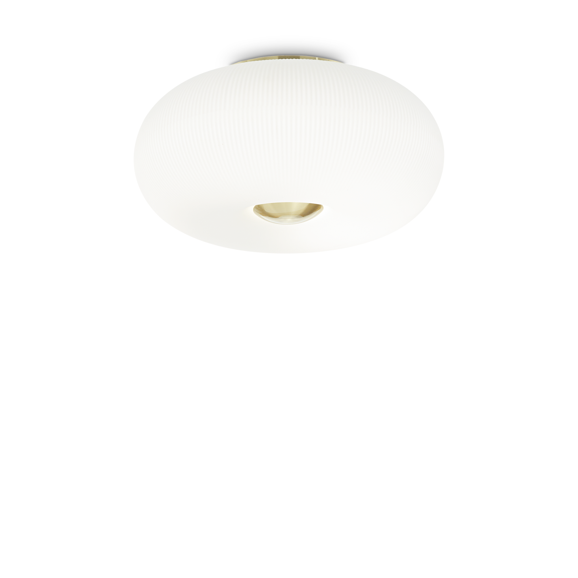 Deckenleuchte Arizona pl5 mit Metallrahmen aus satiniertem Messing. Diffusor aus geblasenem weißem Glas, geätzt und mit dekorativen Reliefrillen. Glühbirnen im Lieferumfang enthalten.