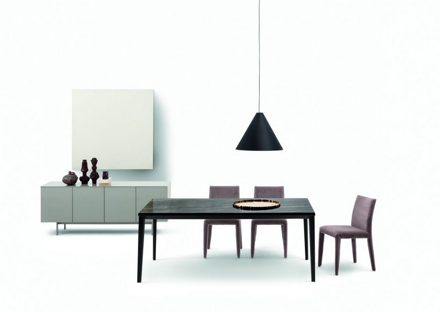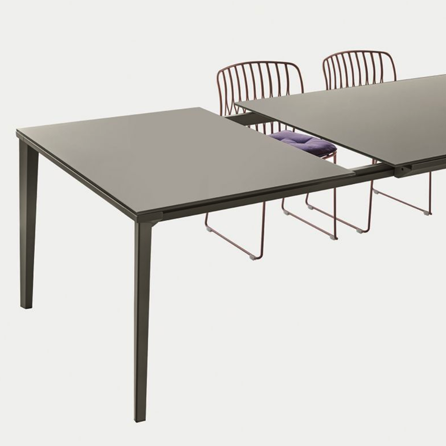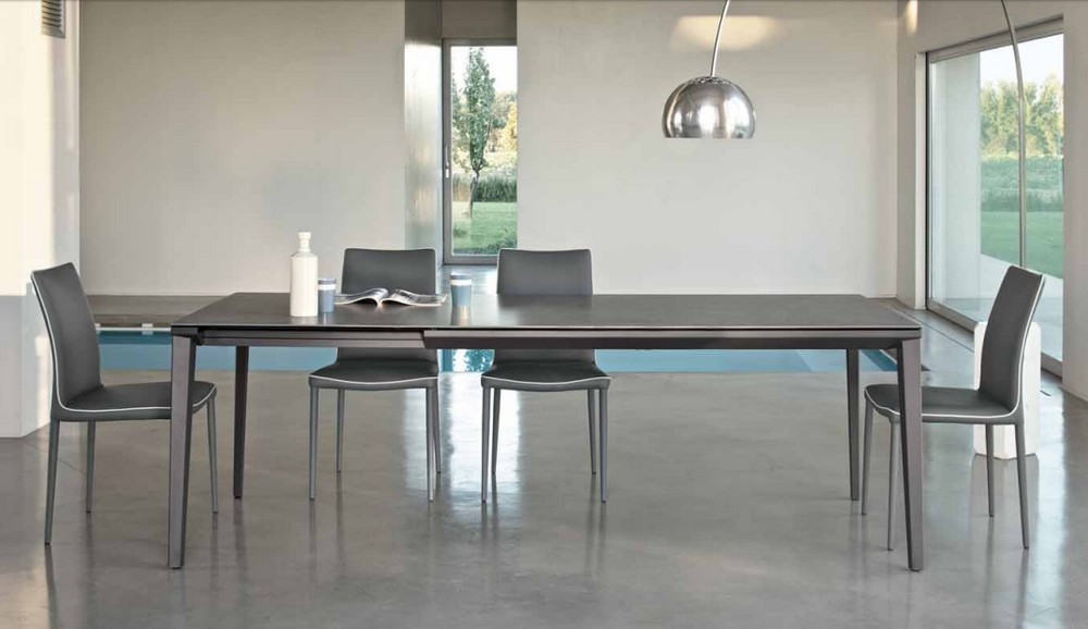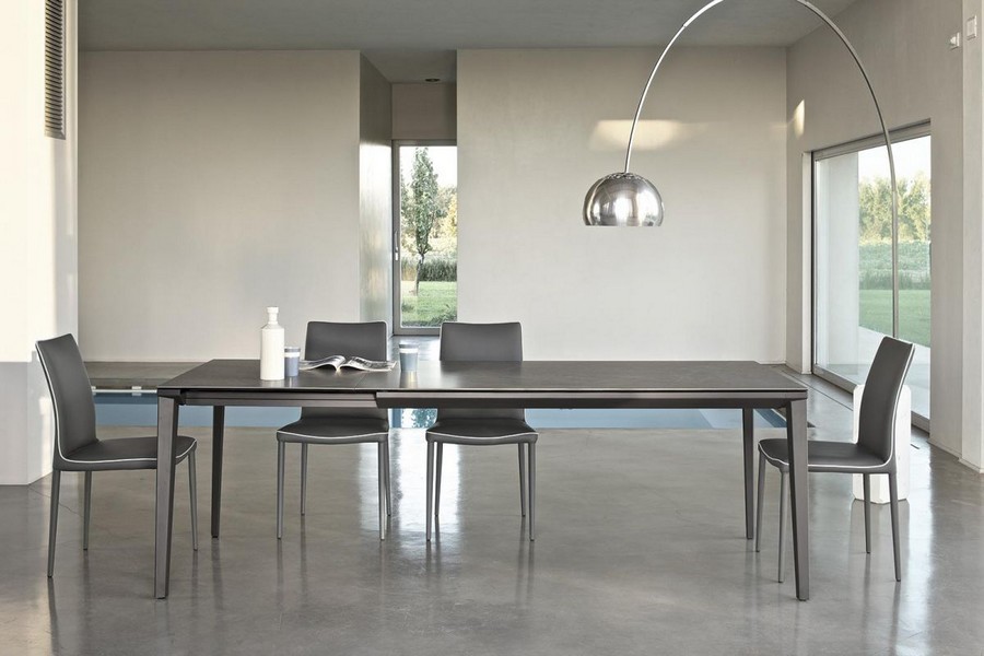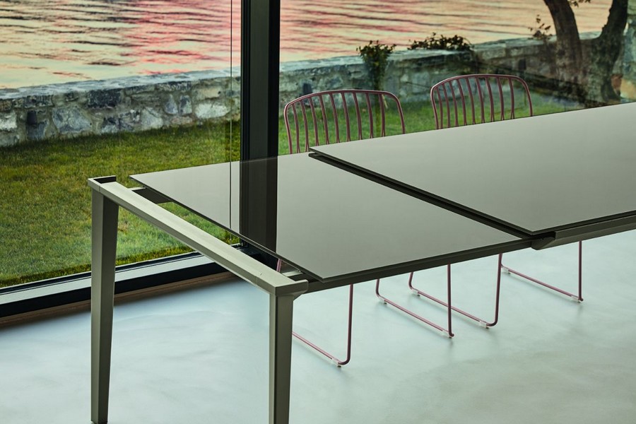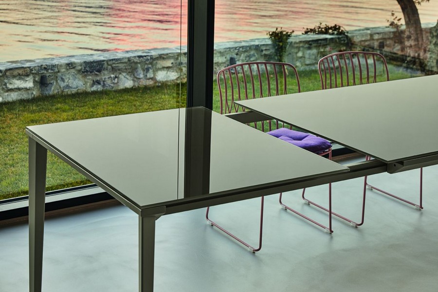 Der Echo-Tisch von Bontempi. Das Gestell besteht aus Aluminium und lackiertem Stahl, Tischplatte und Verlängerungsplatte sind in Glas, Superkeramik oder Supermarmor erhältlich. Dank seiner schlanken, leichten und eleganten Linienführung eignet sich der Echo-Tisch ideal für Küche und Wohnzimmer.