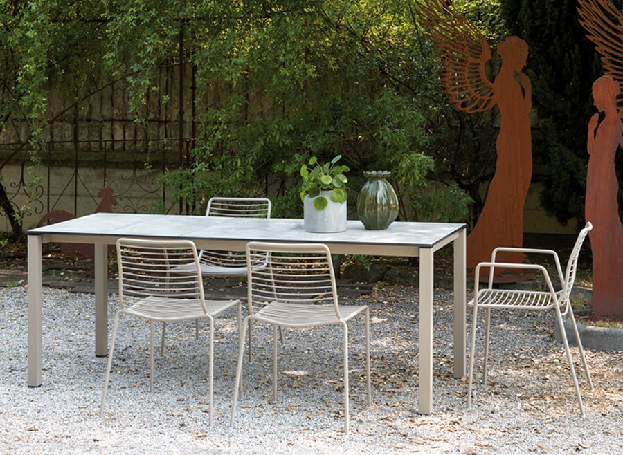 Mit einem Handgriff lässt sich der ausziehbare Tisch Pranzo von 160 auf 210 cm verlängern und bietet so unbegrenzten Platz für Gäste im Innen- und Außenbereich. Lackiertes Metallgestell. 50 x 50 mm Vierkantrahmen und Beine aus verzinktem Stahl mit matter Pulverbeschichtung. Ausziehbar mit Kugellagern. 12 mm starke HPL-Laminatplatte. Für den Innen- und Außenbereich geeignet.
