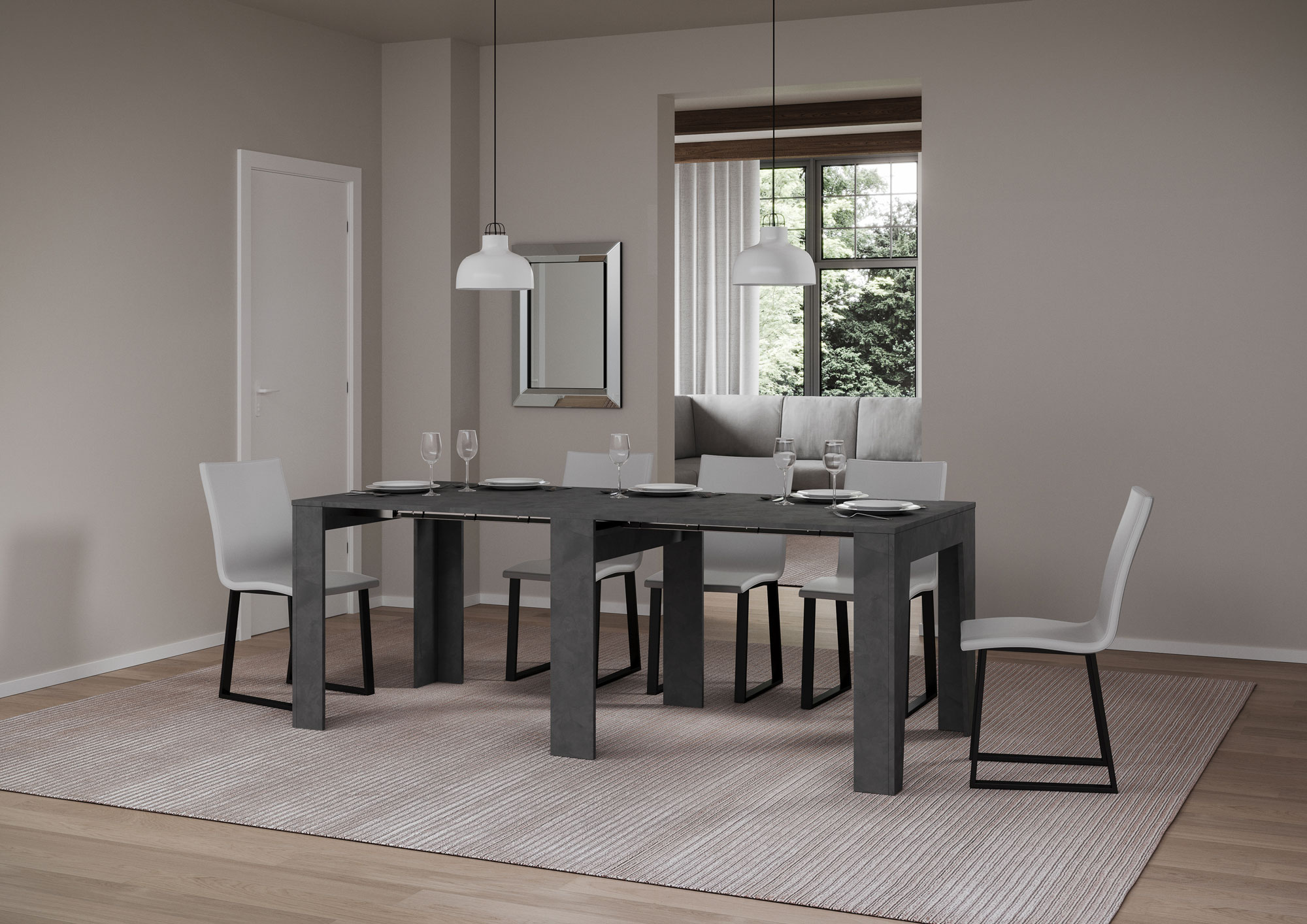 Schmale, ausziehbare Konsole, vielseitig und robust, eine perfekte Ergänzung für jeden Raum im Haus: Eingang, Küche, Esszimmer, Wohnzimmer oder Flur. Die schmale, ausziehbare Konsole lässt sich leicht in einen großen Esstisch mit einer Länge von bis zu 181 cm verwandeln, der Platz für 8 Personen bietet. Hergestellt aus Melaminplatten. Das Ausziehsystem mit Teleskopführungen aus Aluminium und die mitgelieferte zentrale Stütze machen die Konsole stabil und robust. Sobald die Konsole geschlossen ist, müssen die Verlängerungen an anderer Stelle verstaut werden. ityhome-Produkt. Hergestellt in Italien. Abmessungen: Geschlossene Konsole: L.90 T.25 H.77 cm. Länge mit 1 Verlängerung: 77 cm. Länge mit 2 Verlängerungen: 129 cm. Länge mit 3 Verlängerungen: 181 cm.