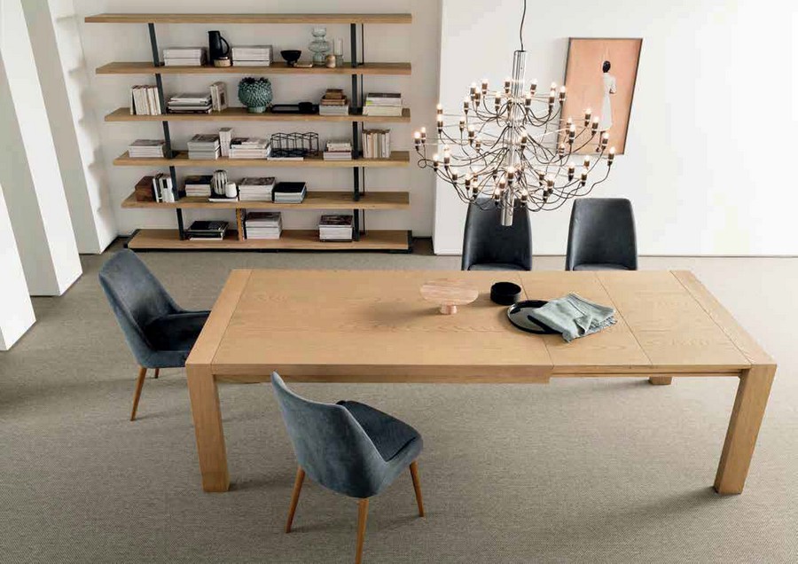 Ausziehbarer Tisch Montreal von Altacorte, komplett aus Massivholz, ausziehbar in 2 Schritten von 45 cm mit im Tisch enthaltenem Booklet-System. Erhältlich in Eiche in verschiedenen Ausführungen. Gebürstete Oberseite.