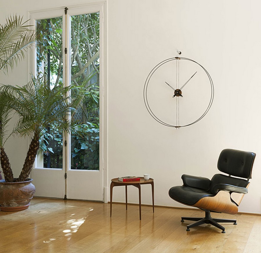 Barcelona ist eine Wanduhr der spanischen Firma Nomon. Eine Designuhr, die aus einem einfachen Accessoire ein echtes Möbelstück wird, der Hauptdarsteller unseres Wohnbereichs. Handgefertigte High-End-Uhr mit einem Durchmesser von 90 cm. Hergestellt aus schwarz lackierten Zeigern aus Walnussholz, Motorbox aus natürlichem Walnussholz und schwarzer Glasfaserstruktur.