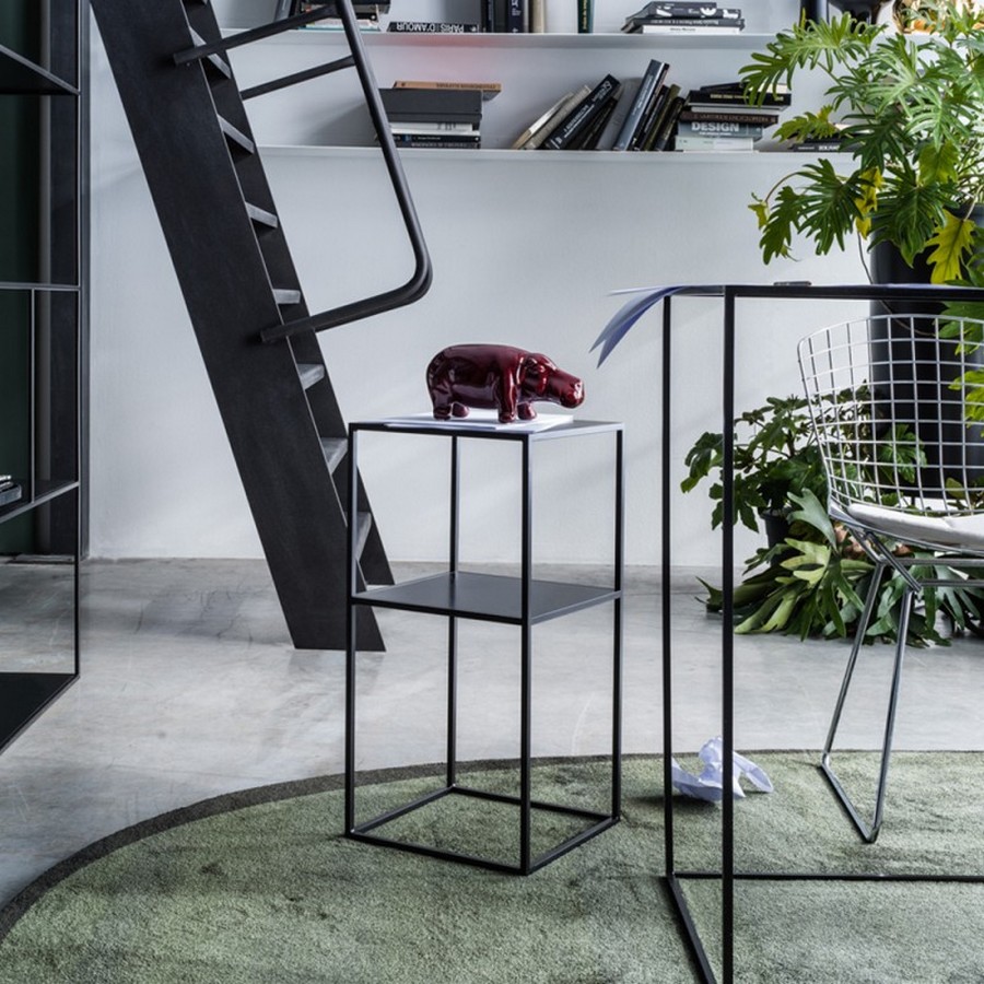 Beistelltisch aus der Passepartout-Kollektion aus 10 x 10 mm dickem Metall mit anthrazitfarbener Epoxidfarbe. Side zeichnet sich durch ein schlichtes Design und leichte Linien mit integrierten Regalen aus, die ohne sichtbares Befestigungssystem montiert werden.