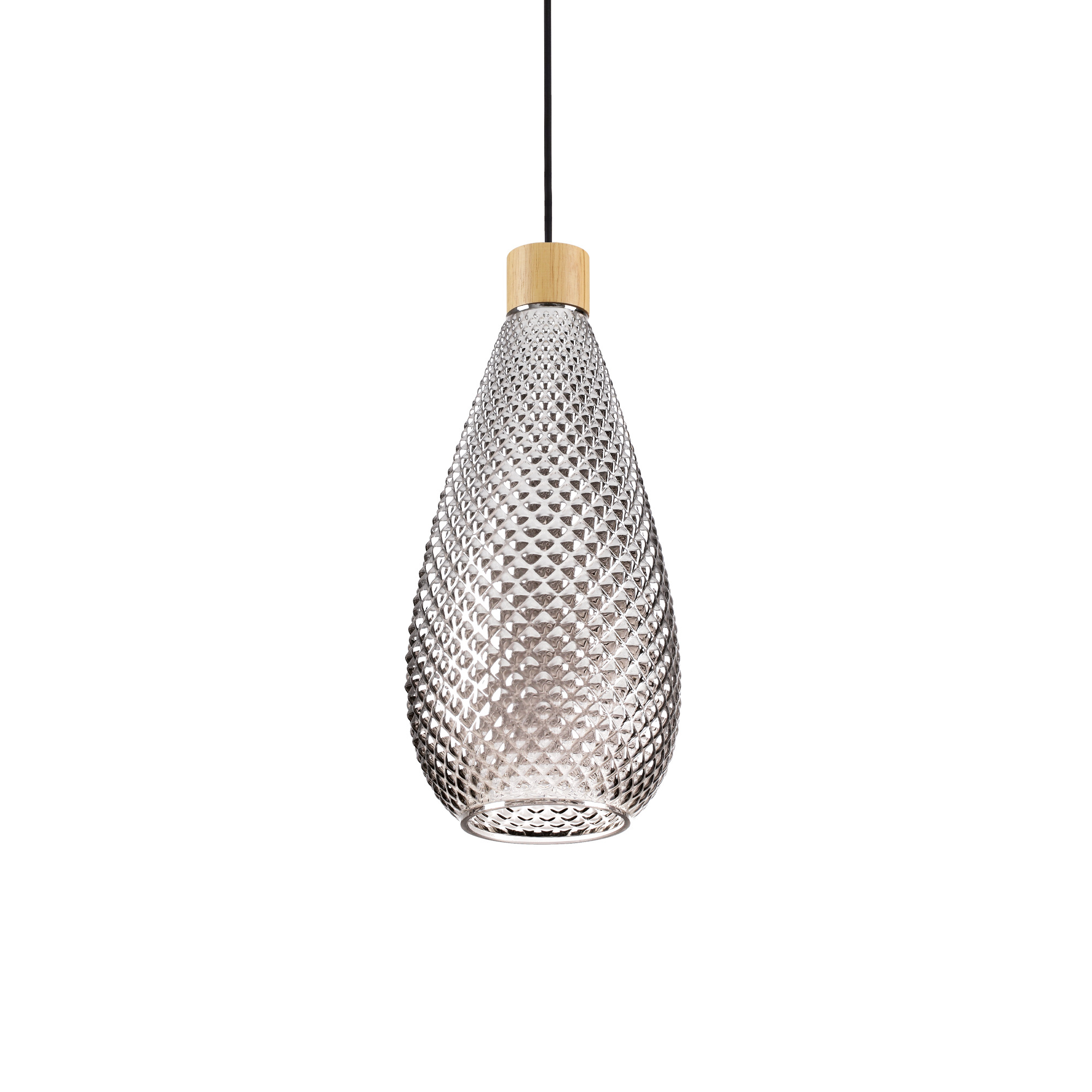 BERGEN-2 SP1 Pendelleuchte von Ideal Lux mit schwarz pulverbeschichteter Metallrosette. Rahmen aus Naturholz. Transparenter Diffusor aus mundgeblasenem Glas mit dekorativem Reliefmotiv und rauchfarbener Oberfläche. Stoffummanteltes Kabel. Glühbirne ausgeschlossen.
