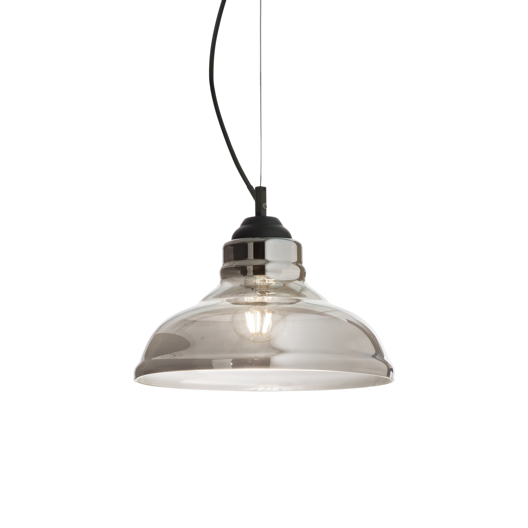 BISTRO' SP1 Plate Smoke Pendelleuchte von Ideal Lux mit schwarz lackiertem Metallrahmen. Diffusor aus Rauchglas, mundgeblasen und handgefertigt. Glühbirne ausgeschlossen.