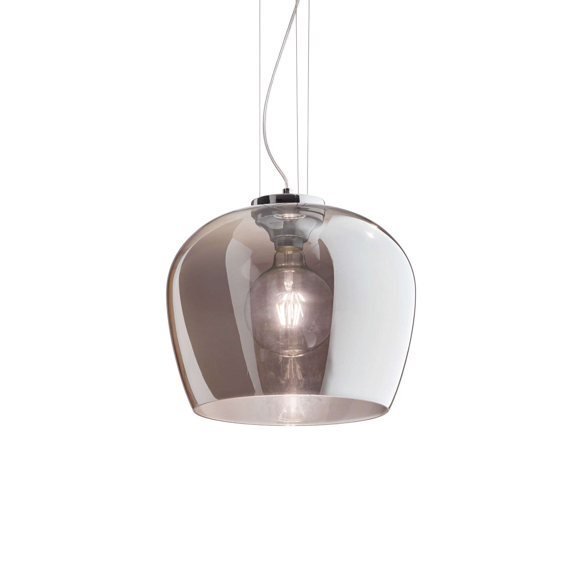 BLOSSOM SP1 Smoke Pendelleuchte von Ideal Lux mit verchromtem Metallrahmen und Rosette. Transparenter Diffusor aus mundgeblasenem Glas mit rauchfarbener Oberfläche. Transparentes PVC-Elektrokabel. Glühbirne ausgeschlossen.