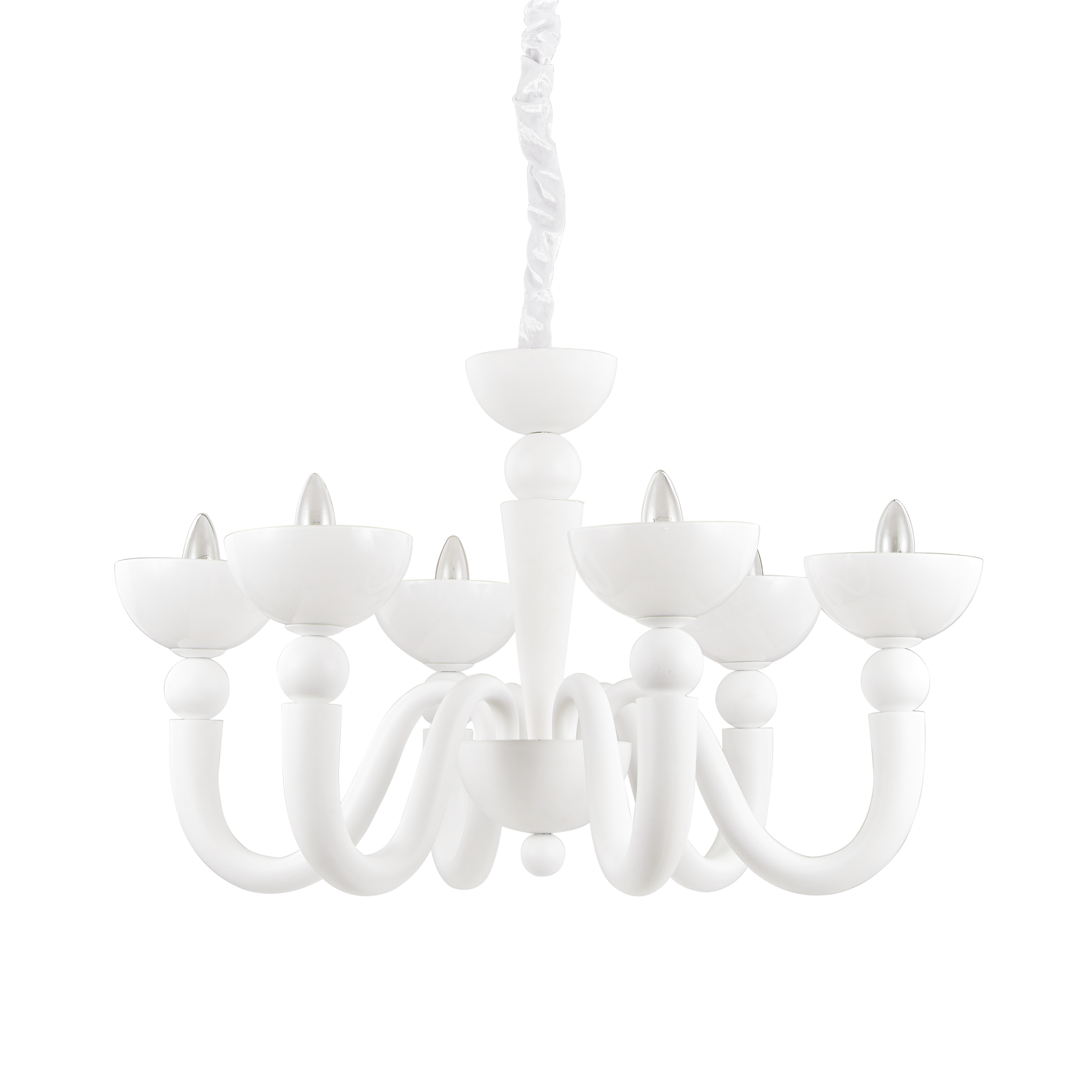 Weißer Pendelleuchter BON BON SP6 von Ideal Lux mit gegossenem Metallrahmen und mattweißer Lackierung. Bobeche aus geblasenem Glas. Kettenüberzug aus Samt. Leuchtmittel ausgeschlossen.