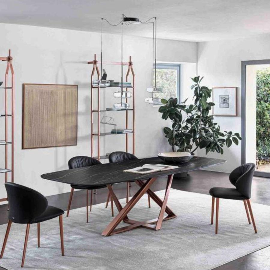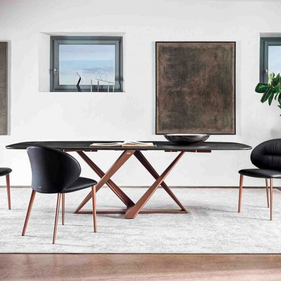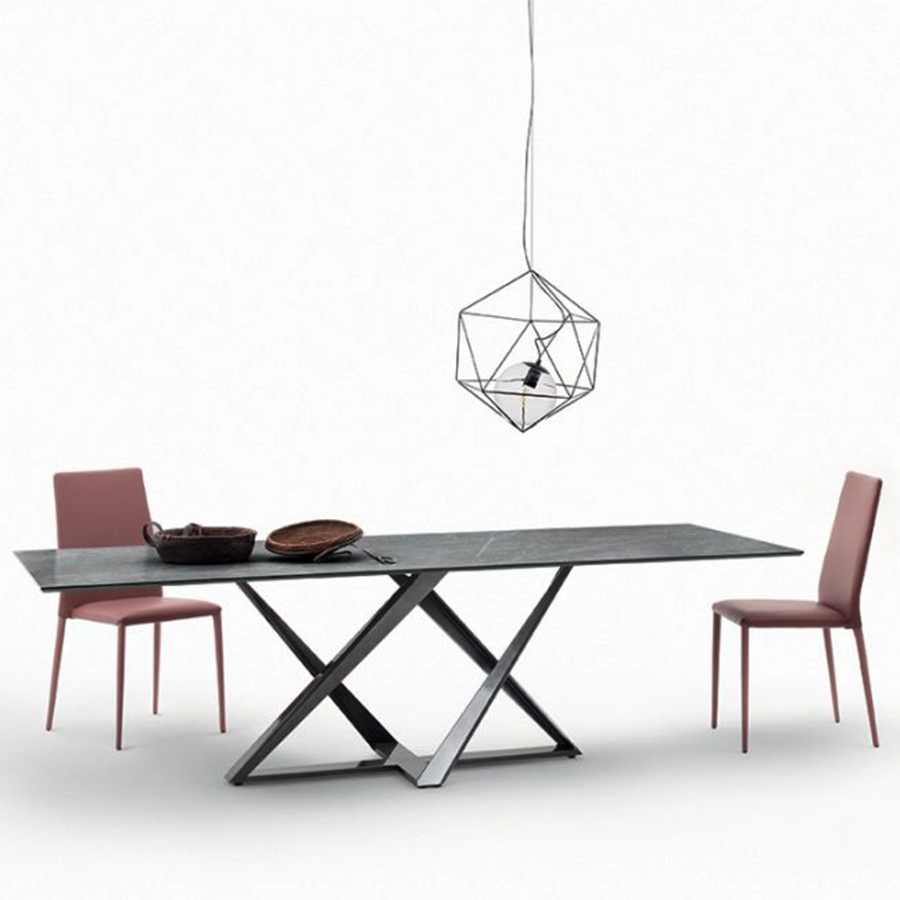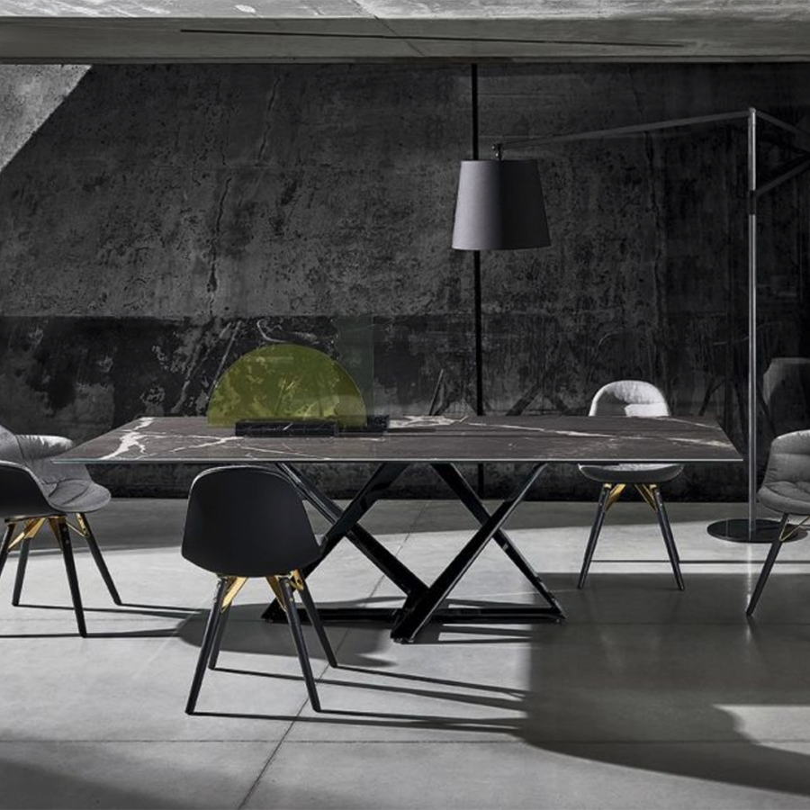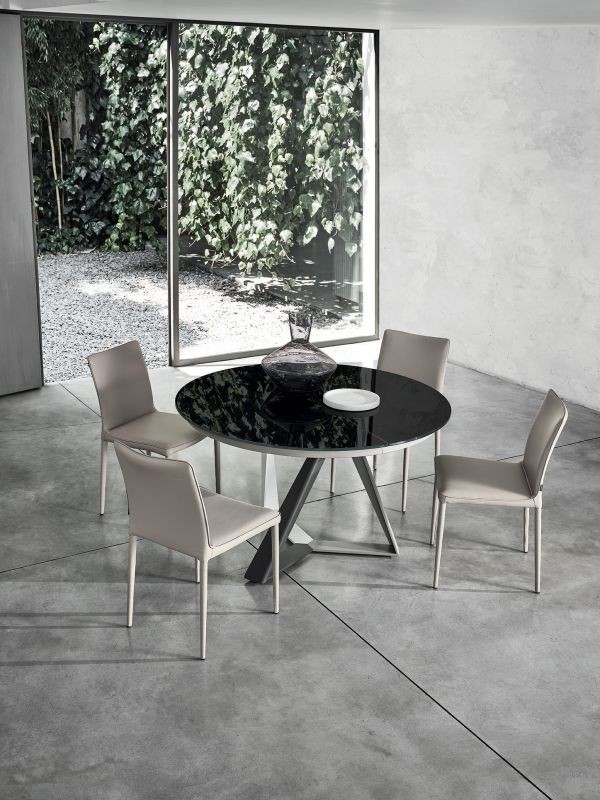 Der feststehende und ausziehbare Tisch Bontempi Millennium zeichnet sich durch seine markante, futuristische Struktur aus, die eine harmonische Dynamik geometrischer Formen erzeugt. Das Tischgestell ist in einfarbig lackiertem Stahl oder in der mehrfarbigen Ausführung Elegant erhältlich. Die Tischplatte ist in Holz, lackiertem Holz, Superkeramik, Supermarmor oder Glas und in verschiedenen Oberflächenausführungen verfügbar.