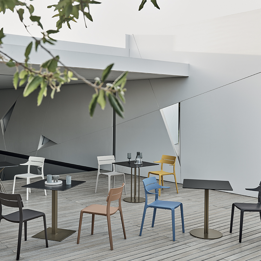 Rocket aus Kunststoff zeichnet sich durch seine Leichtigkeit, gute Widerstandsfähigkeit und leuchtenden Farben aus und ist ideal für den Innen- und Außenbereich des Hauses und ist in der Version mit oder ohne Armlehnen erhältlich. Es wird betont, dass die Stapelbarkeit des Rocket-Stuhls von Bontempi eine optimale Raumoptimierung ermöglicht.