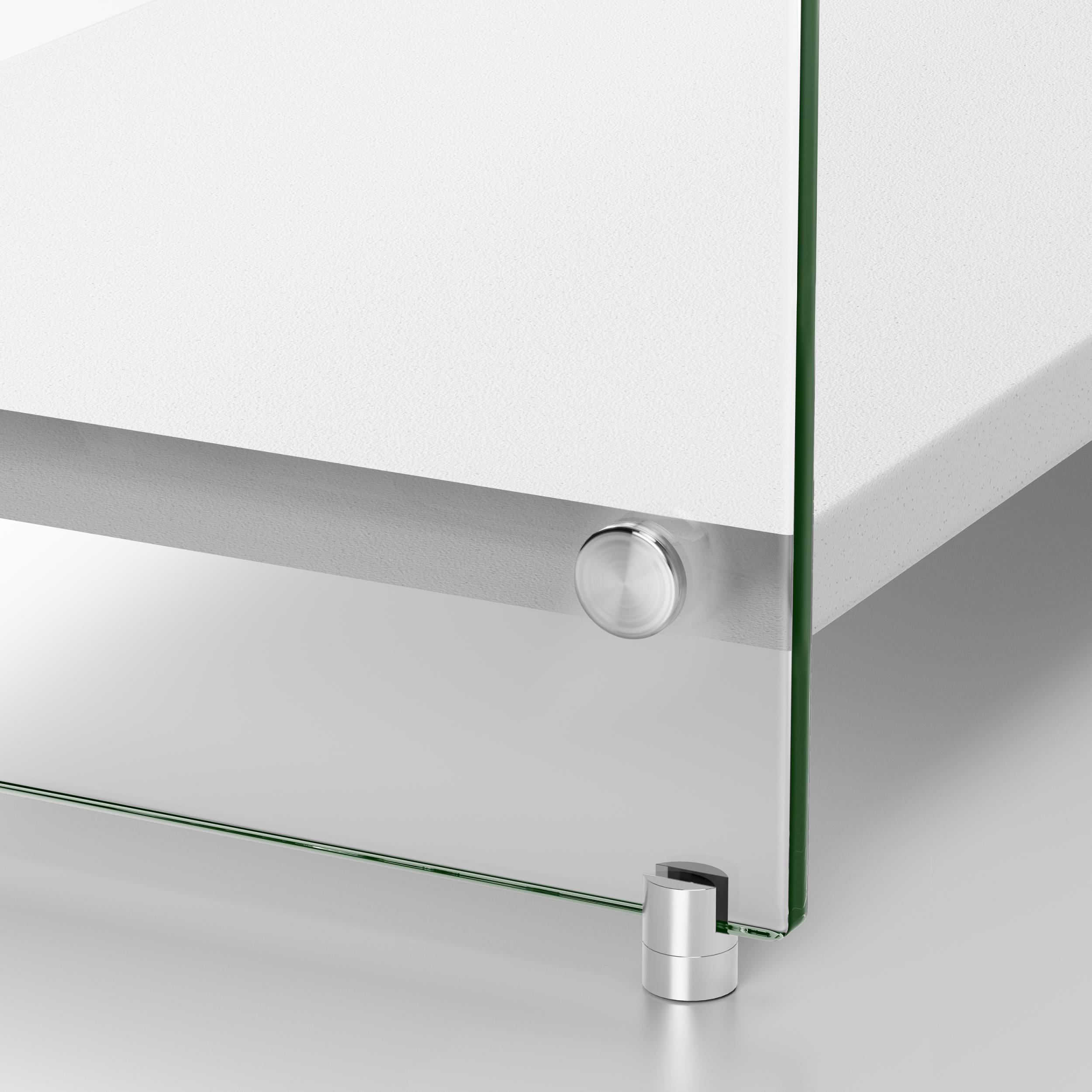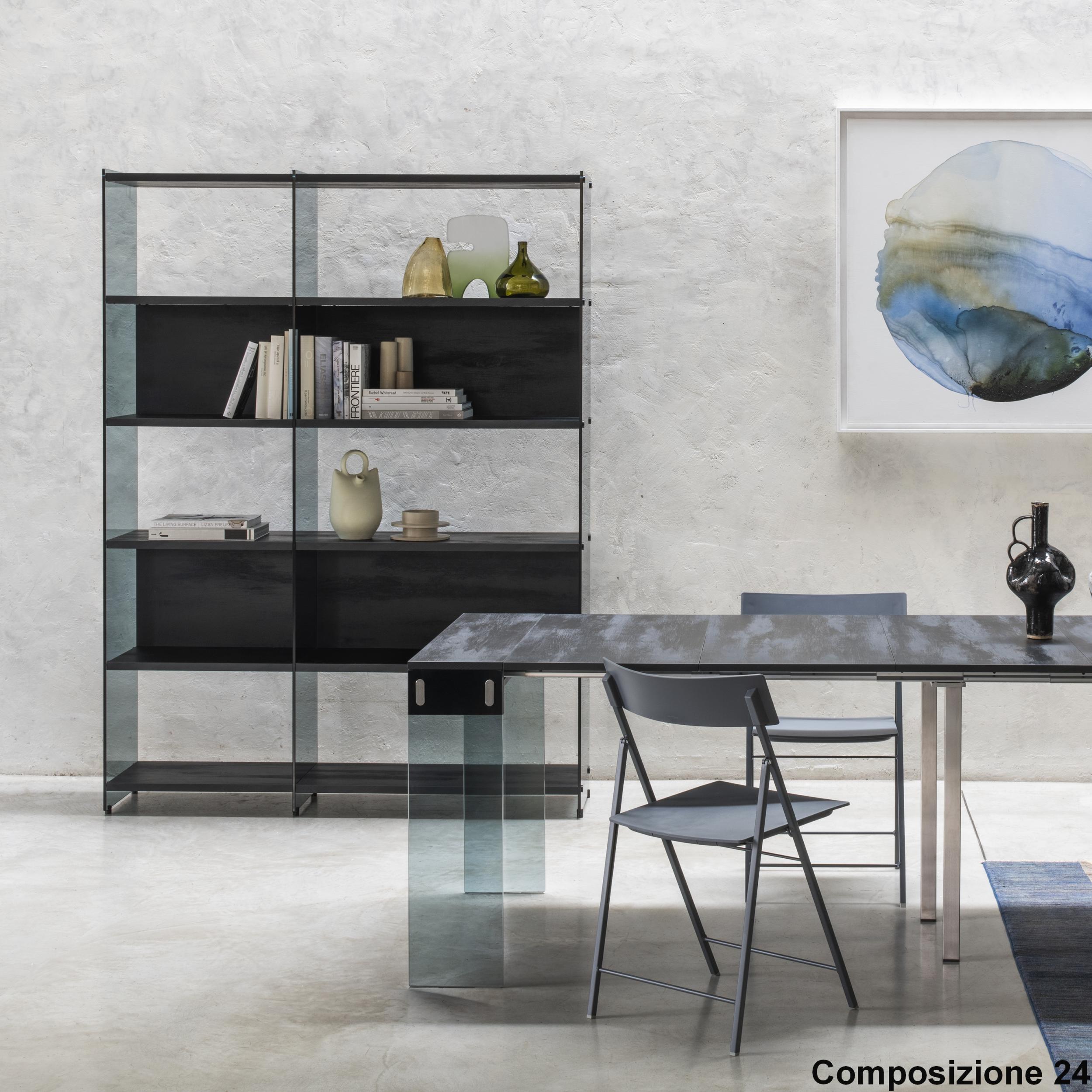 Byblos ist ein elegantes und repräsentatives modulares Bücherregal mit 10 mm starken Seitenwänden aus klarem oder getöntem Sicherheitsglas und 25 mm starken Laminatböden. Das mitgelieferte Aluminium-Montagezubehör macht es zu einem vielseitigen Möbelstück, das sich sowohl für lineare Anordnungen als auch als Raumteiler in der Raummitte eignet.