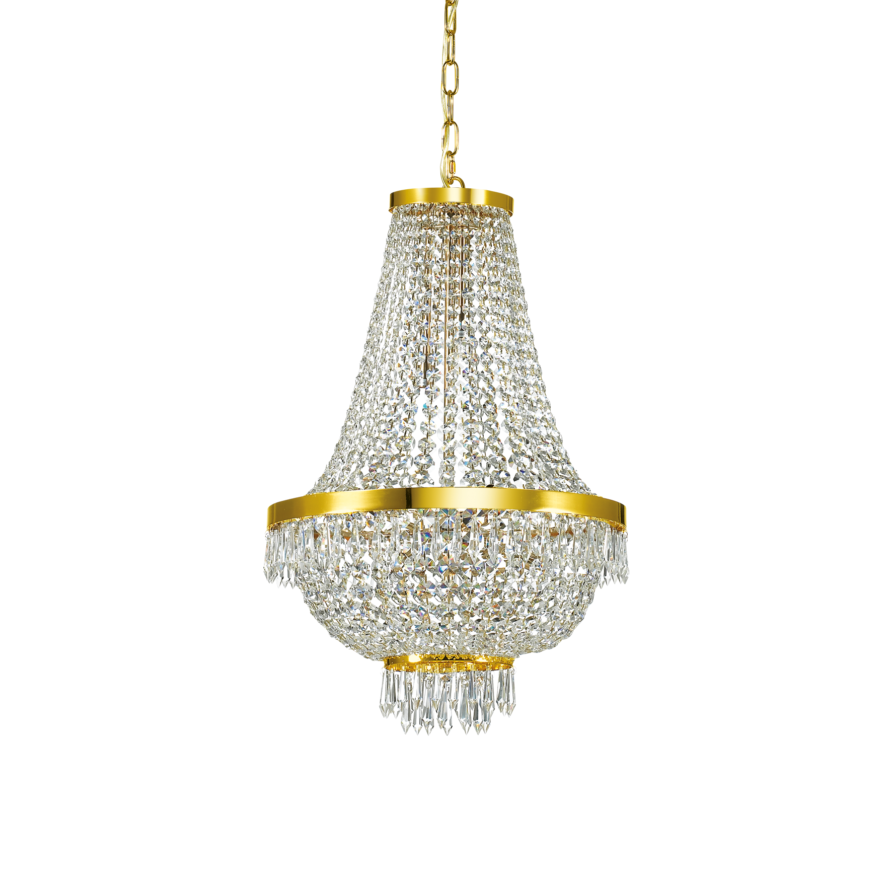 CAESAR SP9 goldener Hängeleuchter von Ideal Lux mit Metallrahmen mit Goldfinish. Achteckig geschliffene Kristalldekorelemente mit spitzen Enden. LED-Leuchtmittel im Lieferumfang enthalten.