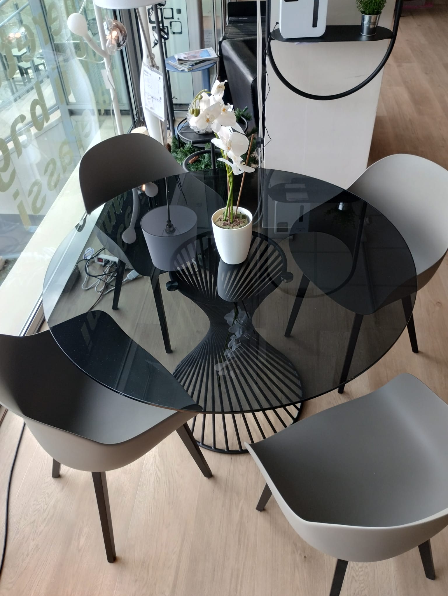Calligaris Vortex Tisch und vier Connubia Academy Stühle, bereit zur Auslieferung.