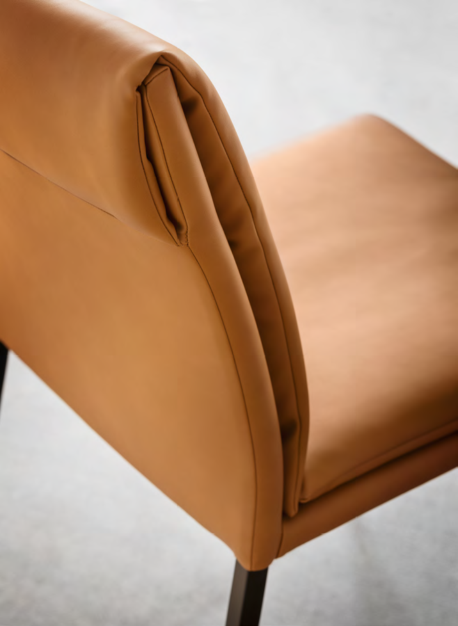 Carmen Large CS2209 Stuhl von Calligaris. Die Carmen-Kollektion zeichnet sich durch klare, minimalistische Linien aus. Die Metallbeine sind ebenso dünn wie Sitz und Rückenlehne, die Polsterung mit festem Kissen bildet jedoch eine attraktive Falte an der Rückseite. Carmen ist auch als Hocker mit Fußstütze erhältlich.