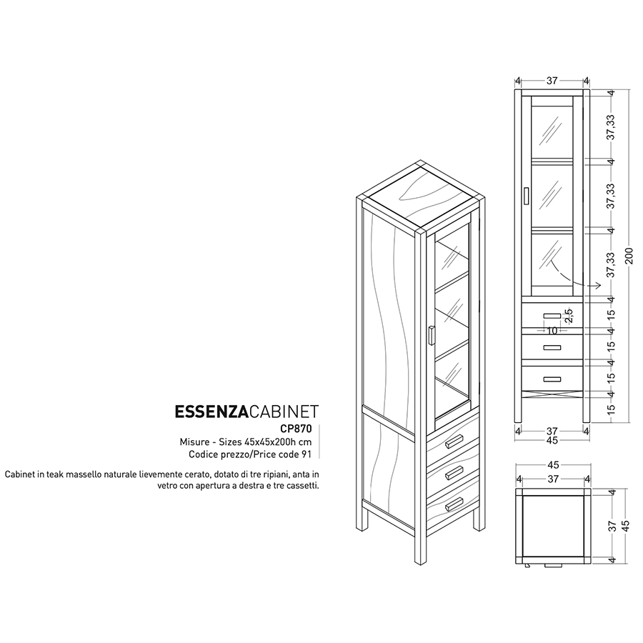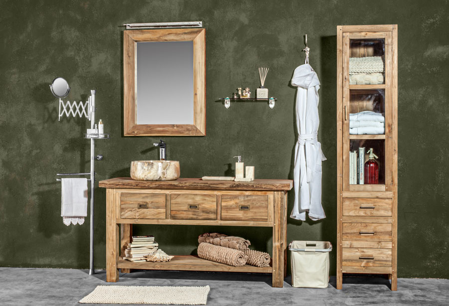 Essenza-Schrank von Cipì komplett aus massivem Teakholz. Ausgestattet mit 3 Schubladen und 3 Regalen zur optimalen Aufbewahrung aller Ihrer Badezimmerutensilien.