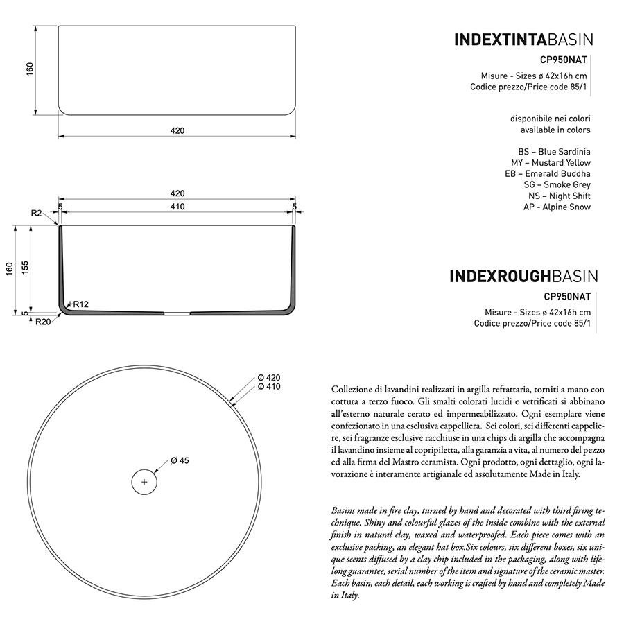 Sammlung von Spülbecken aus feuerfestem Ton, handgedreht mit Drittfeuer-Kochung. Die glänzenden und glasierten farbigen Emails passen zum natürlichen, gewachsten und wasserfesten Äußeren. Jedes Exemplar ist in einer exklusiven Hutschachtel verpackt. Sechs Farben, sechs verschiedene Hutschachteln, sechs exklusive Düfte, eingeschlossen in einem Tonsplitter, der dem Waschbecken zusammen mit der Ablaufabdeckung, der lebenslangen Garantie, der Stückzahl und der Unterschrift des Keramikmeisters beiliegt. Jedes Produkt, jedes Detail, jede Verarbeitung ist vollständig handwerklich und absolut Made in Italy.