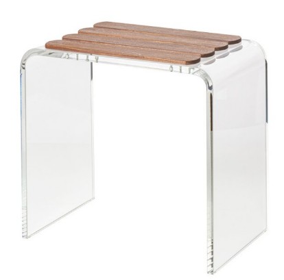 Duschhocker mit Sitz aus behandeltem natürlichem Teakholz und extraklarer Plexiglasstruktur. Rutschfeste Gummis.