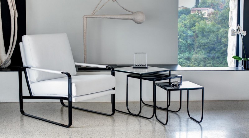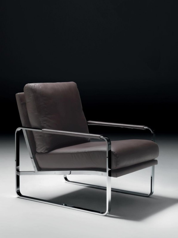 Clarissa ist ein Sessel, der sich durch ein modernes, elegantes und geradliniges Design auszeichnet. Die Struktur besteht vollständig aus lackiertem Stahl. Der Sitz besteht aus zwei großen Kissen, gepolstert und mit Kunstleder, Leder oder Stoff bezogen
