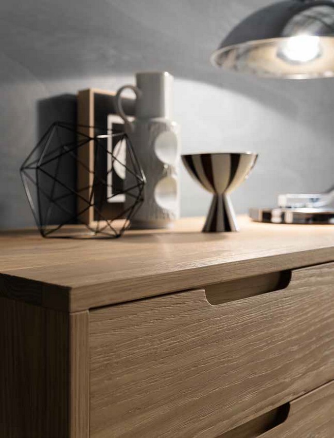 Clover Massivholzkommode von Altacorte mit 3 oder 6 Schubladen. Kommode mit raffiniertem, nie banalem Design, komplett aus gebürsteter massiver Eiche, kunstvoll von erfahrenen Handwerkern gefertigt. Details machen den Unterschied.