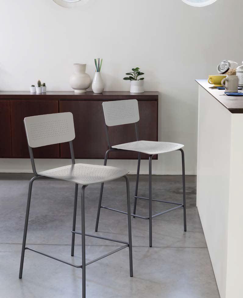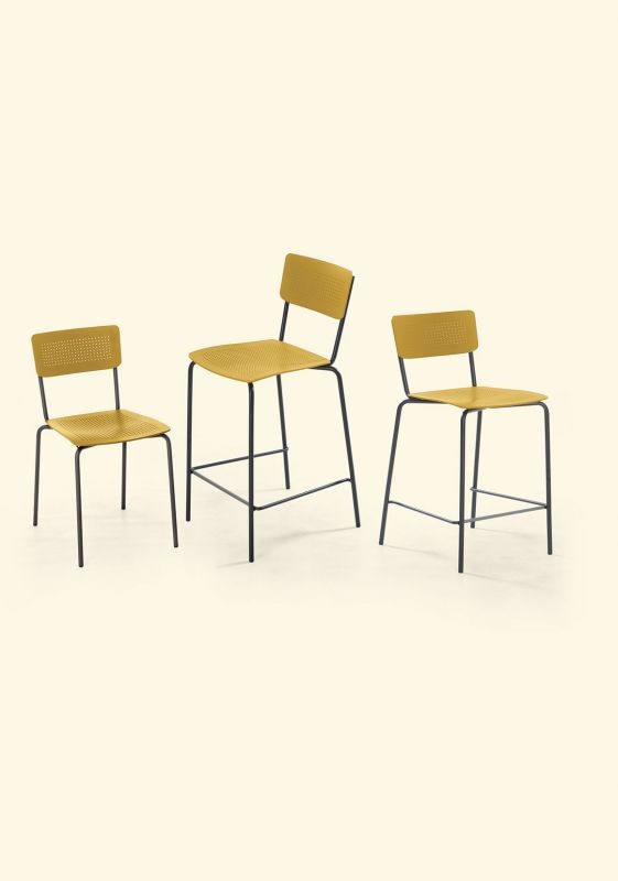 Der College Hocker hat ein lackiertes Stahlgestell und eine Sitzfläche aus perforiertem Polypropylen und ist stapelbar. College wird aus innovativen Materialien hergestellt und ist in einer Indoor- und einer Outdoor-Version in zwei verschiedenen Höhen erhältlich.