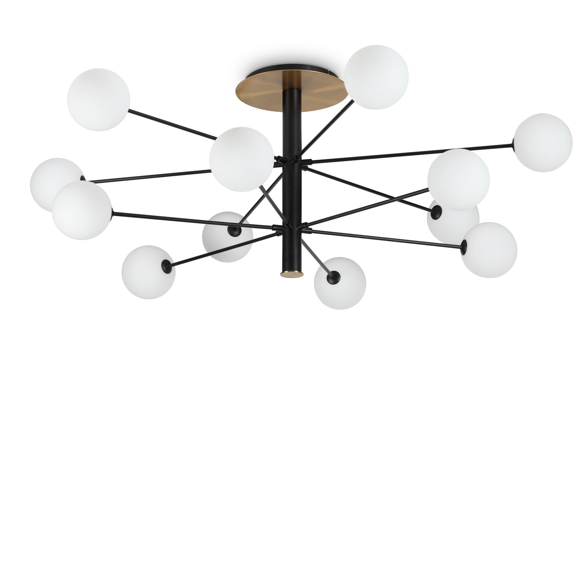 Deckenleuchte Cosmopolitan pl12 aus schwarzem Messing von Ideal Lux mit matt lackiertem Metallrahmen. Diffusoren aus geätztem weißem geblasenem Glas. Farben: Schwarz mit satinierten Messingdetails. LED-Leuchtmittel im Lieferumfang enthalten.