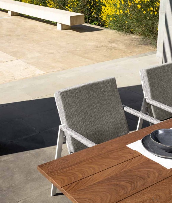 Der Esstisch 240 x 110 mm aus der Cottage-Kollektion vereint rustikalen und minimalistischen Stil. Die Tischplatte aus Iroko-Holz ruht auf einem robusten Aluminiumgestell, dessen schräge Beine die geradlinige Form unterbrechen. An diesem großzügig dimensionierten Esstisch finden bis zu 10 Personen Platz.