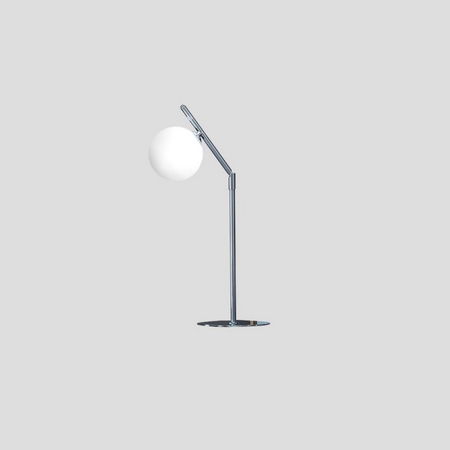 Dada Tischleuchte mit Gelenkstruktur aus verchromtem oder goldenem Metall. Lampenabdeckung aus weißem Glas. Der Tisch Dada Table bietet die Möglichkeit, das Licht nach Wunsch zu positionieren.