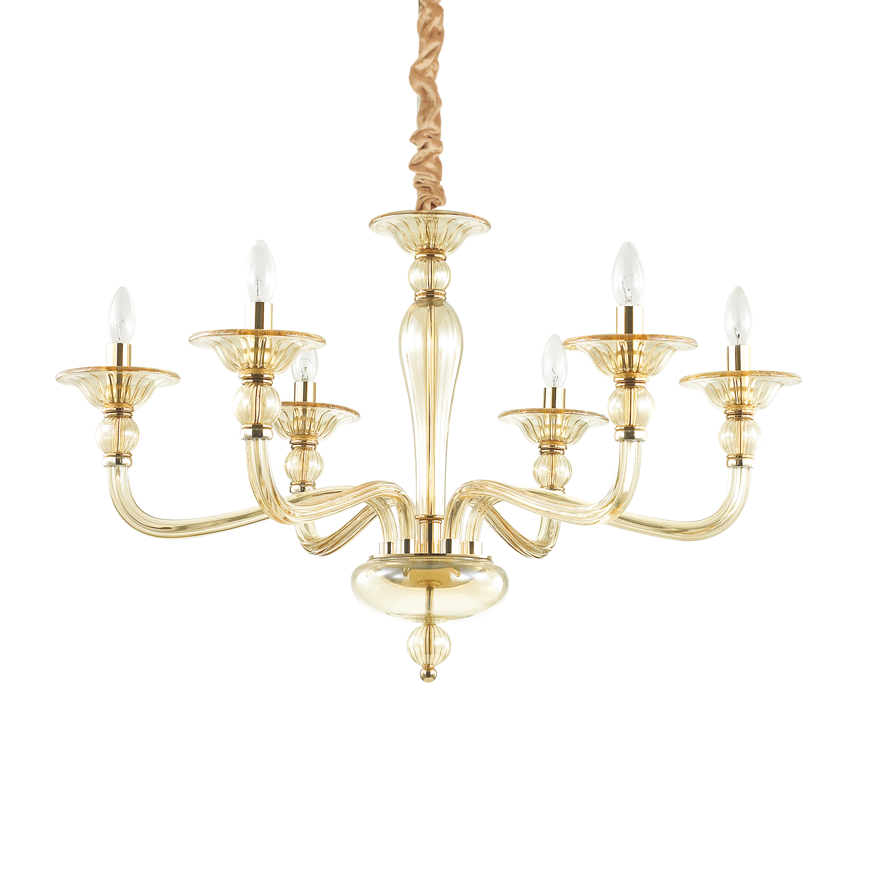 DANIELI SP6 Bernstein-Hängeleuchter von Ideal Lux mit goldenem Metallrahmen. Dekorative Elemente aus bernsteinfarbenem mundgeblasenem Glas. Kettenüberzug aus Samt. Leuchtmittel ausgeschlossen.