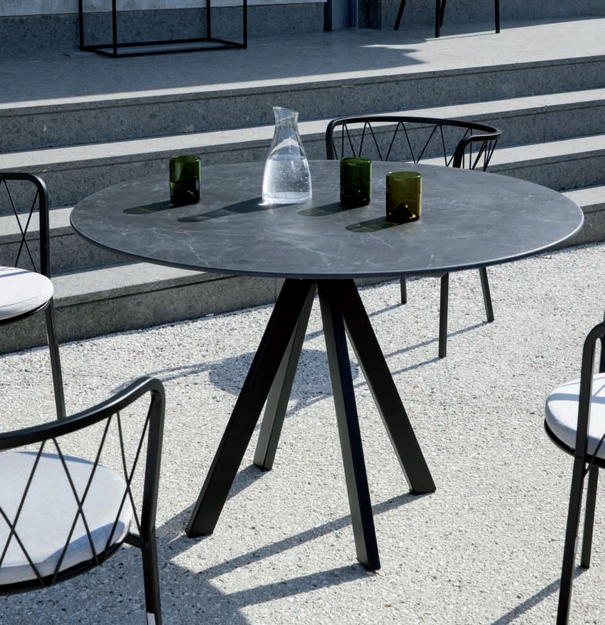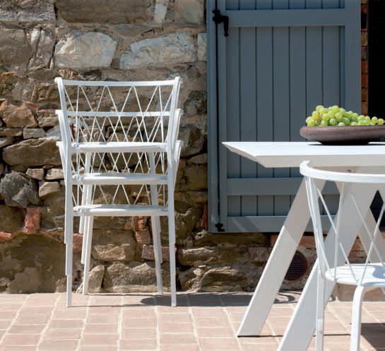 Eine Kollektion mit zeitgenössischem Geschmack, bei der die Verflechtung geometrischer Grundformen und essentieller Linien eine dynamische und funktionale Atmosphäre schafft. Das Wohnzimmer im Freien wird zu einem fließenden und manchmal traumhaften Raum, der sich perfekt in jede Umgebung einfügt.