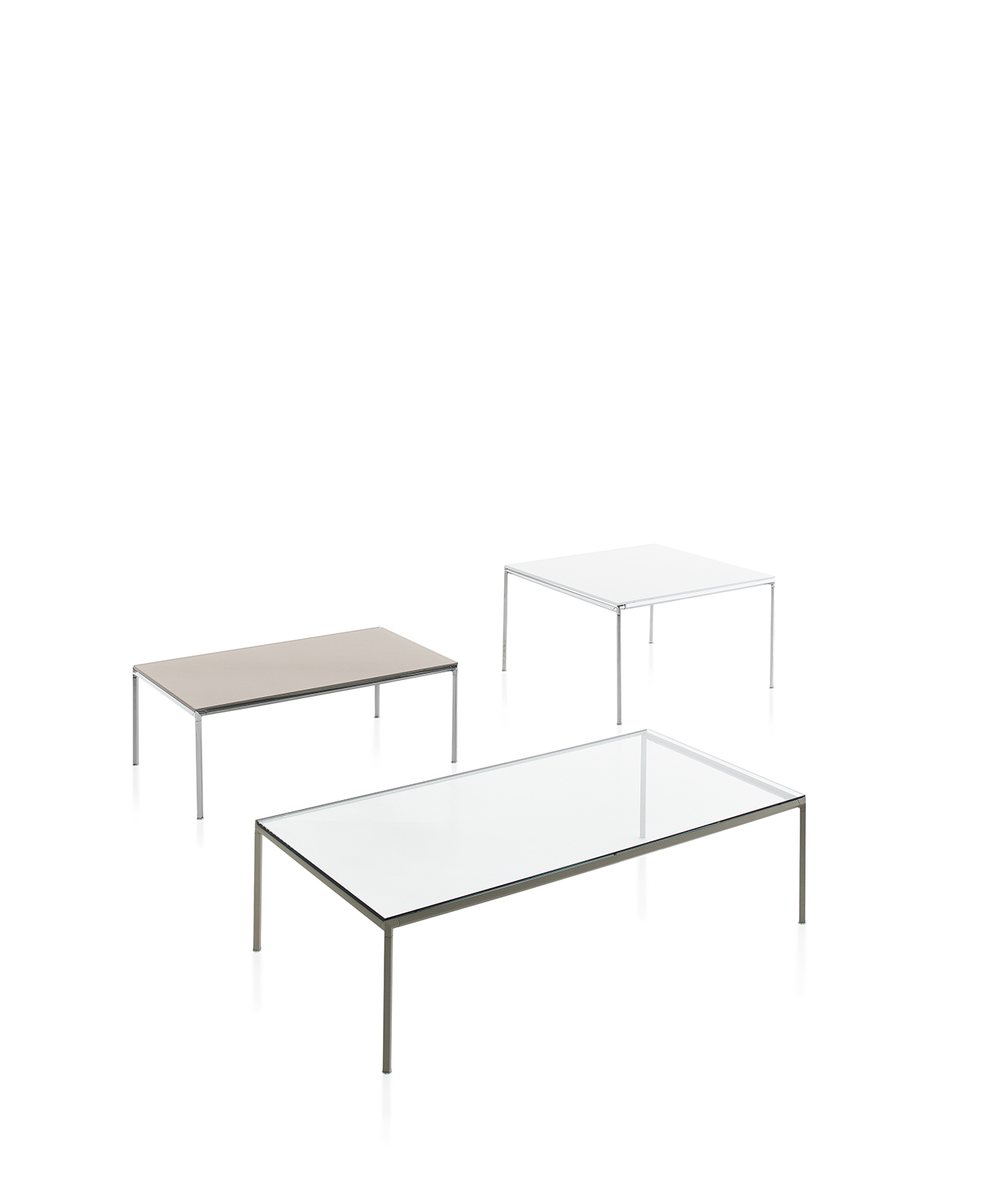 Couchtisch mit quadratischer oder rechteckiger Glasplatte, lackiertem Stahlgestell und in zwei verschiedenen Höhen erhältlich.