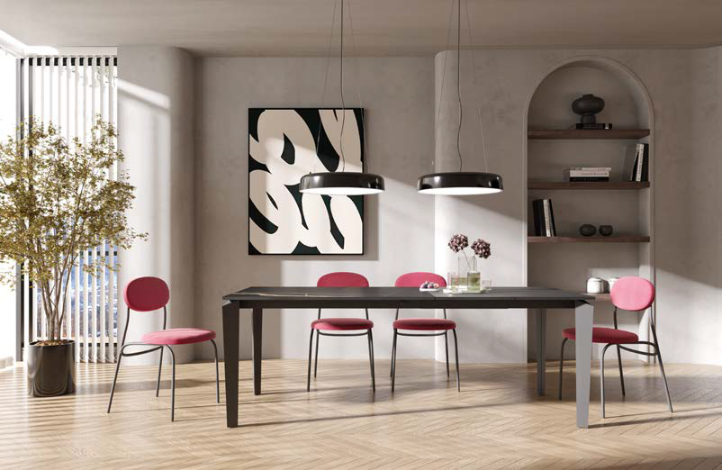Ausziehbarer oder fester Tisch mit patentierter Teleskop-Ausziehführung aus Aluminium, mit Beinbrücke aus lackiertem Metall in verschiedenen Ausführungen und Verlängerungsplatte in verschiedenen Materialien und Ausführungen.