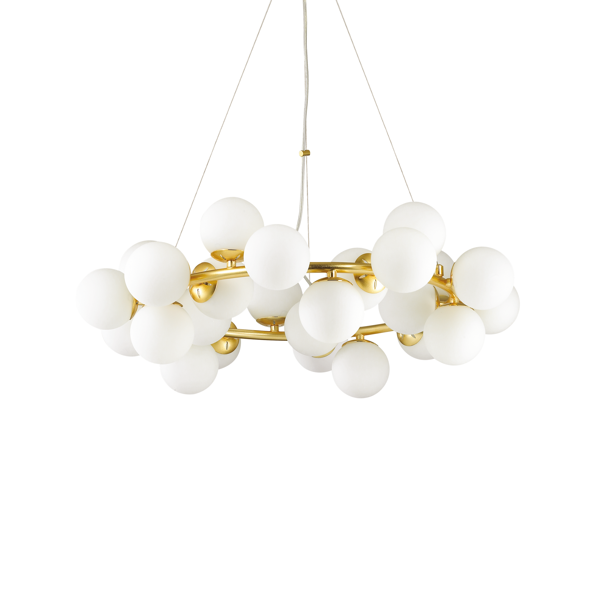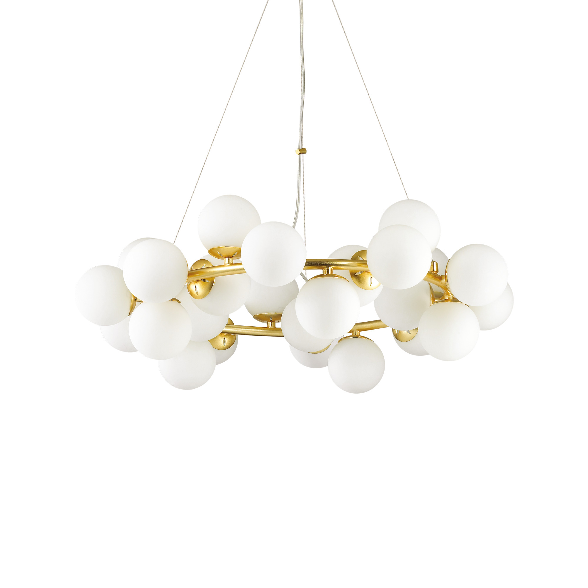 DNA SP25 Hängeleuchter von Ideal Lux mit Rosette und goldenem Metallrahmen. Diffusoren aus weißem, geblasenem und geätztem Schichtglas. Verstellbare Stahlseile. LED-Leuchtmittel im Lieferumfang enthalten.