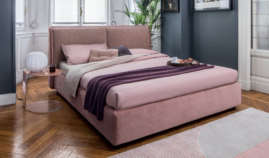 Dolly CS6086 Bett von Calligaris. Dolly interpretiert das Kopfteilelement auf originelle Weise neu und integriert zwei Kissen in ein umhüllendes Element, das wahlweise in der gleichen oder einer anderen Ausführung erhältlich ist unterschiedlich, für einen Zweiton- oder Zwei-Material-Effekt. Als Bettkasten mit Stauraum konzipiert, ist Dolly auch mit festem Untergestell und verschiedenen Fußvarianten erhältlich.