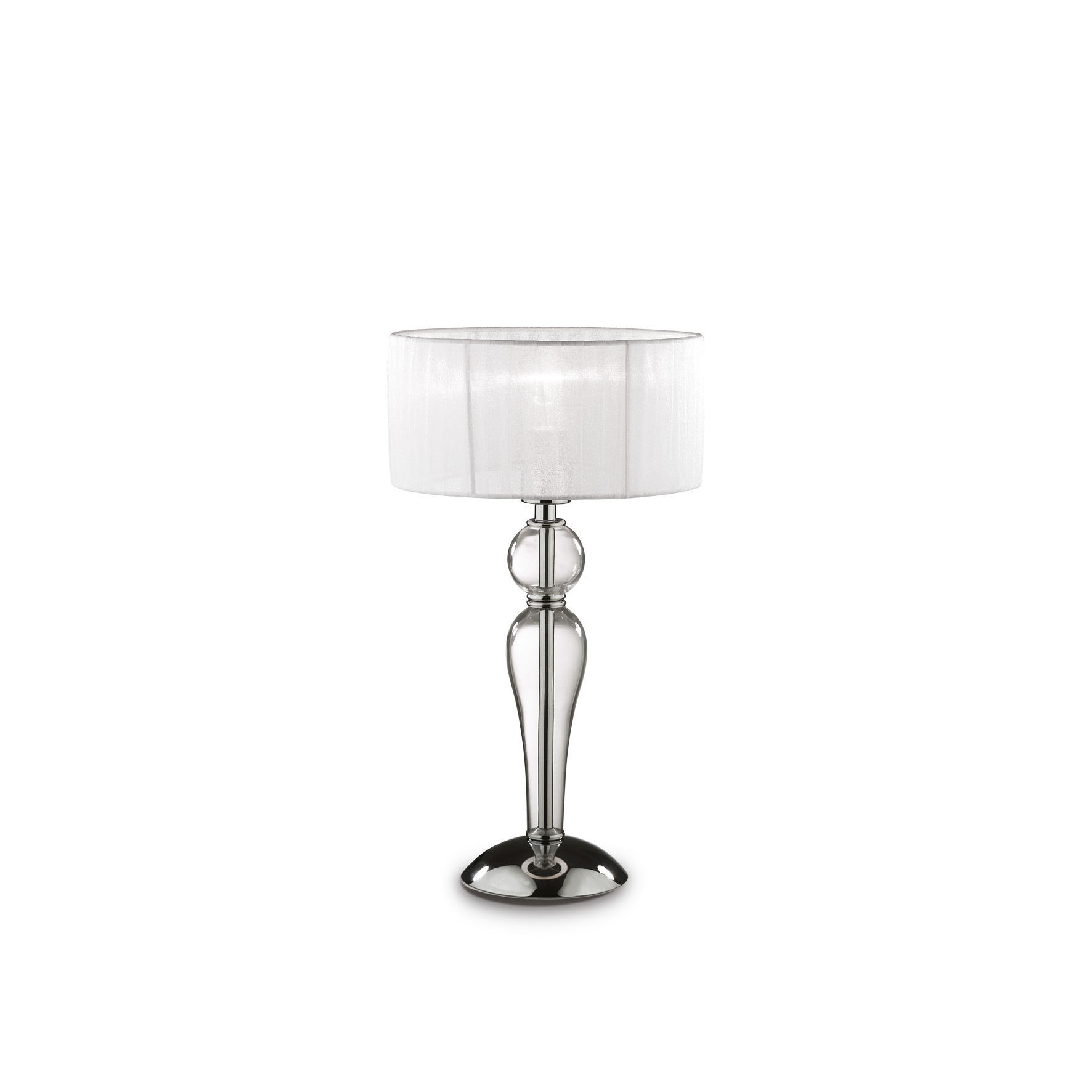 DUCHESSA TL1 SMALL Tischleuchte von Ideal Lux mit verchromtem Metallsockel und Details. Dekorative Elemente aus mundgeblasenem und handgefertigtem Glas. Lampenschirm aus plissiertem Organzastoff. Glühbirne ausgeschlossen. Lampe mit integriertem Schalter.